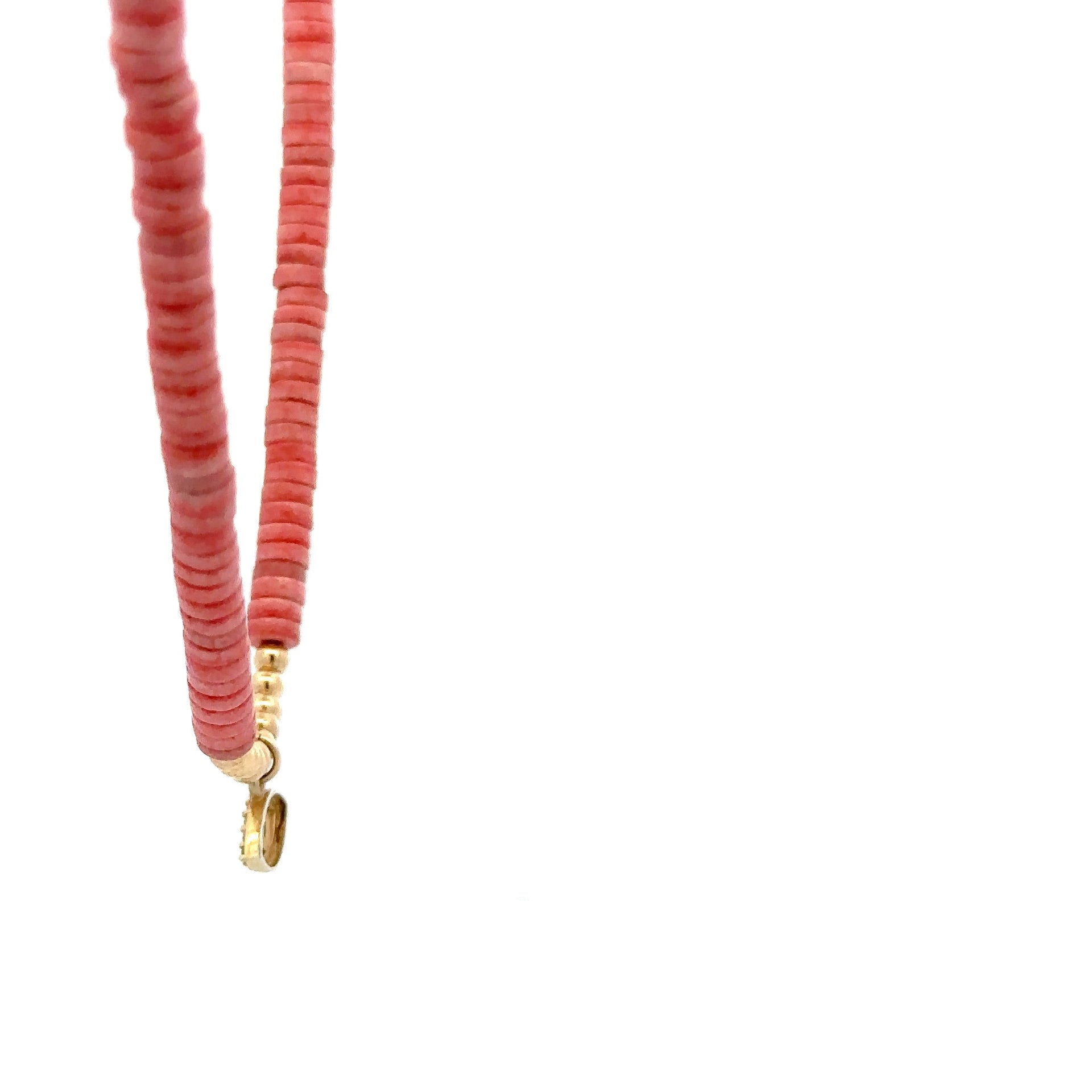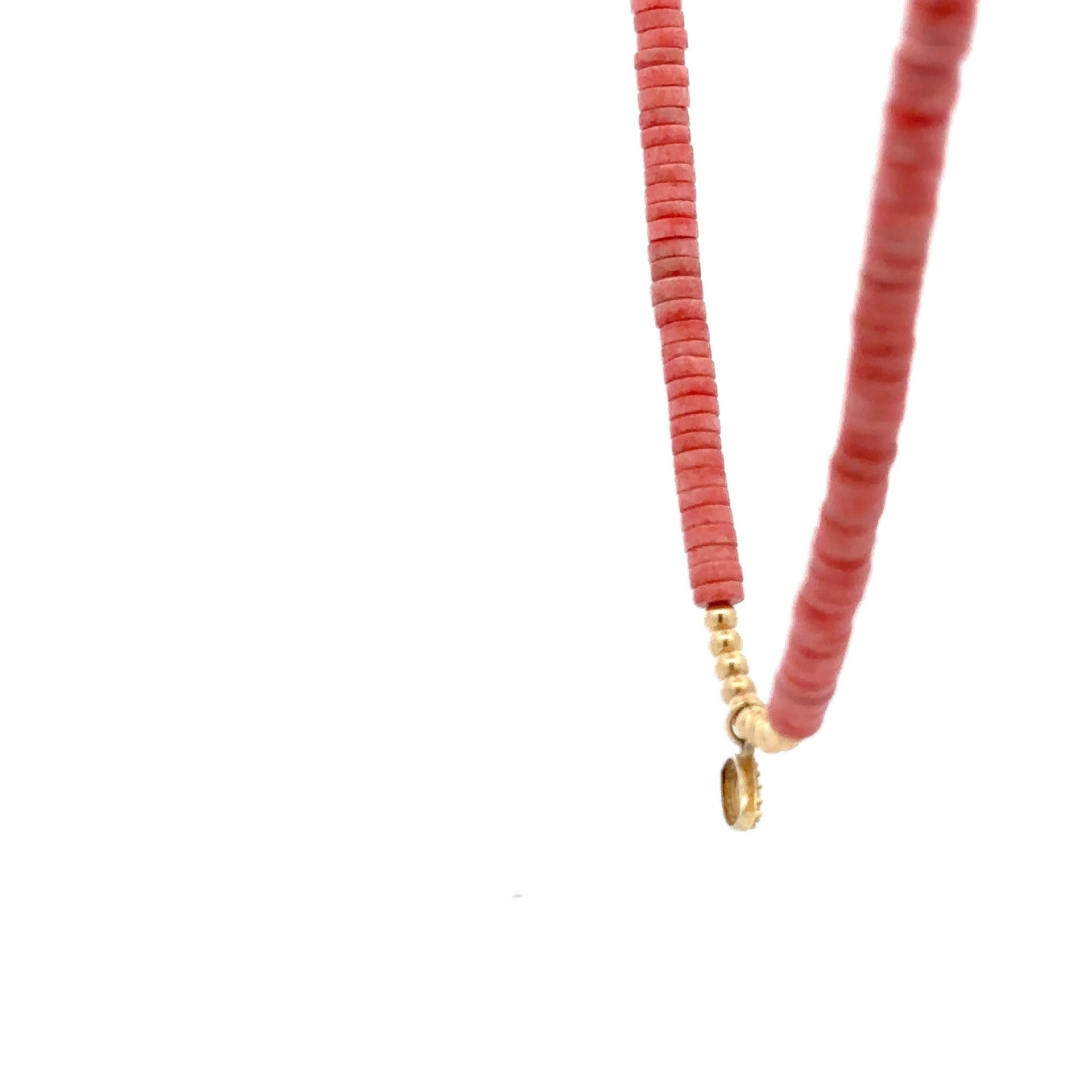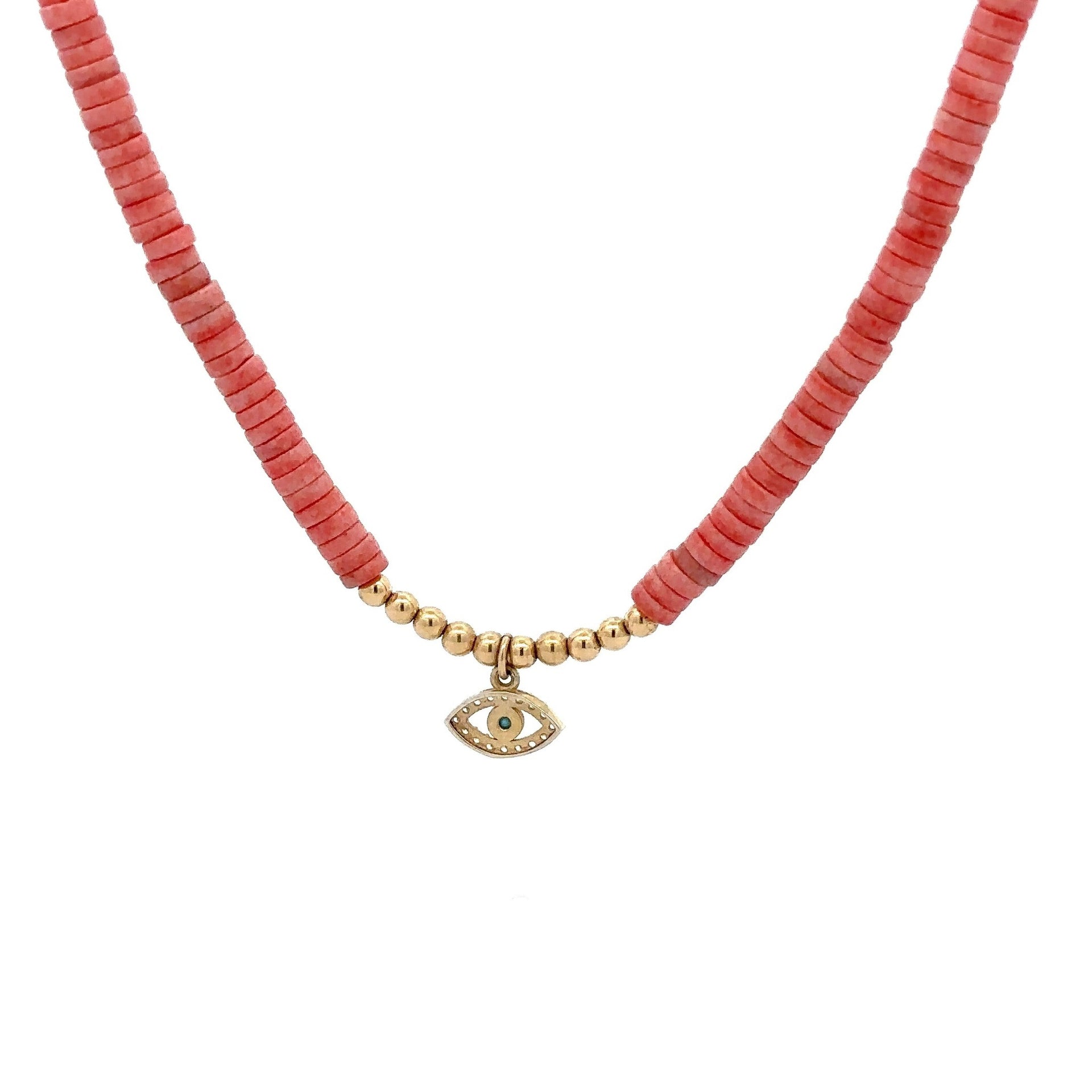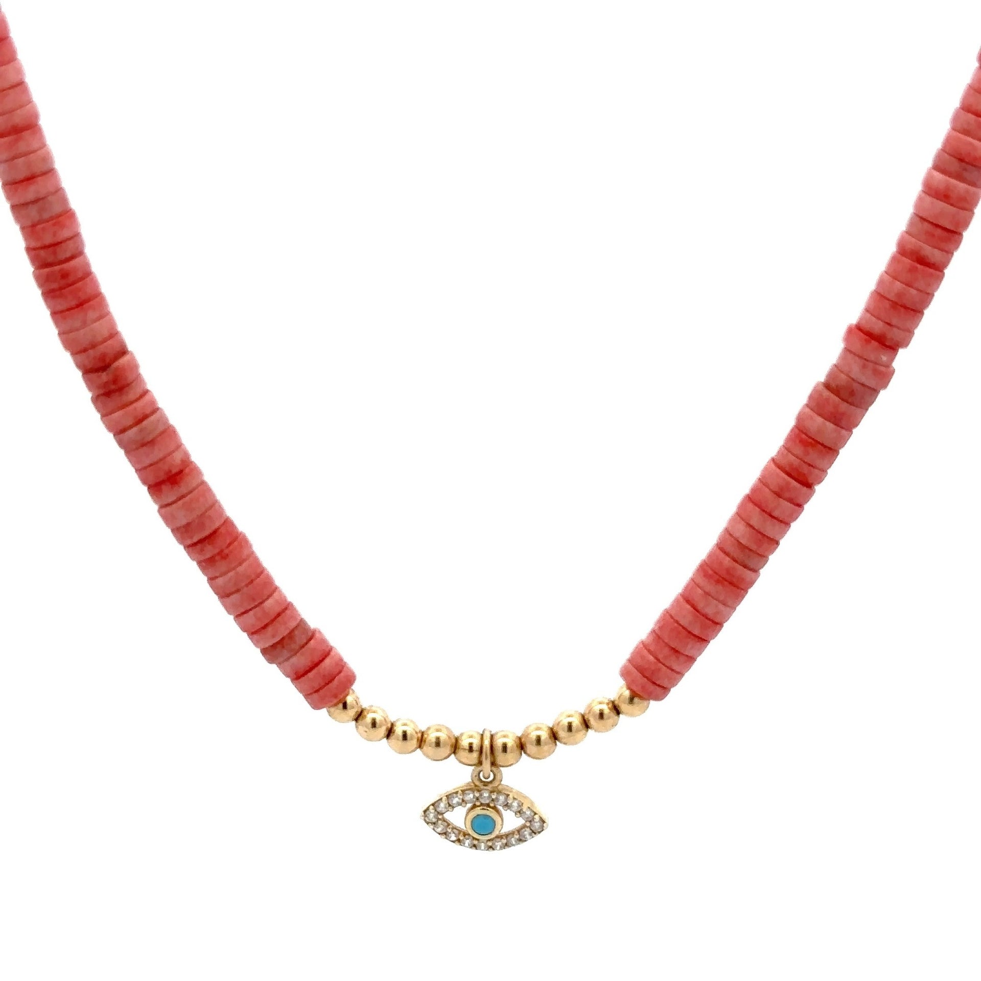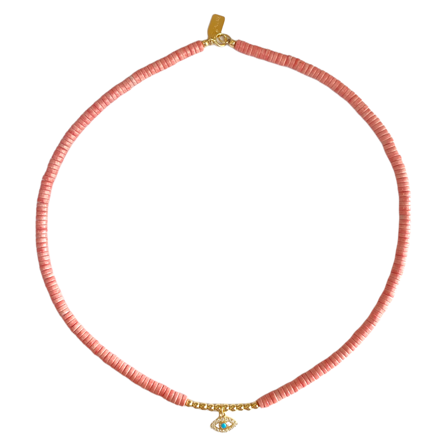 Kleurrijke ketting met goudkleurige bolletjes en een klein hangertje in de vorm van een geluksoog.