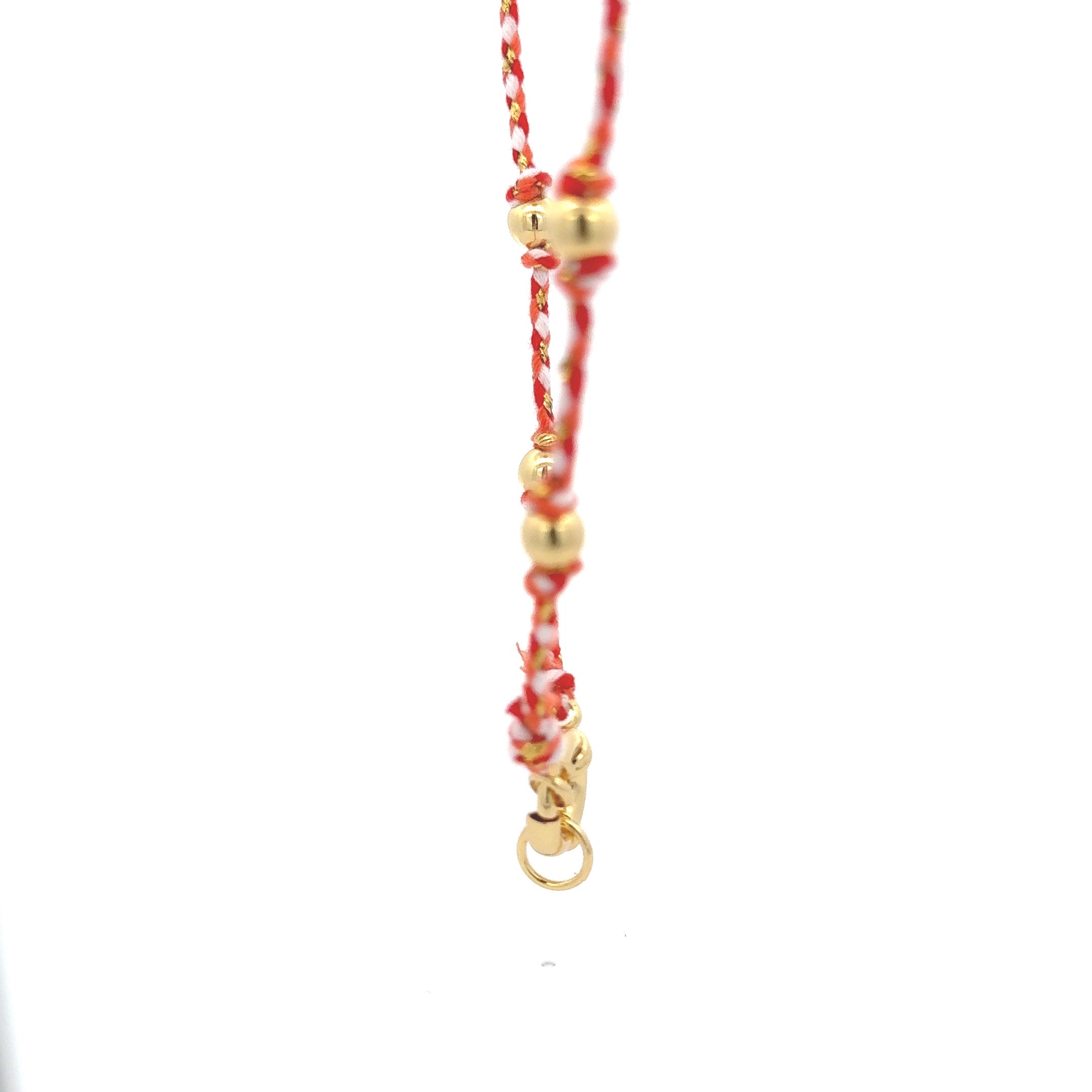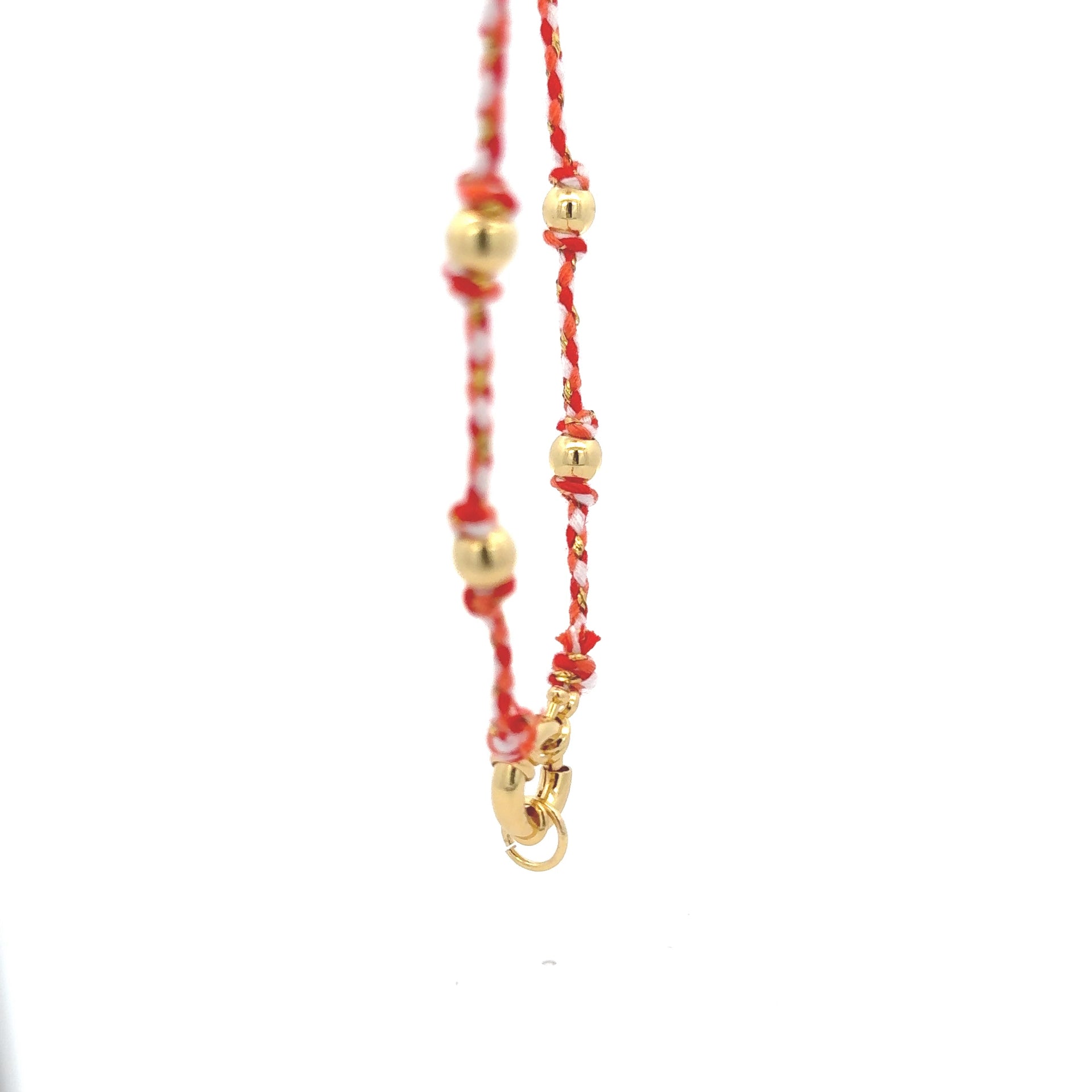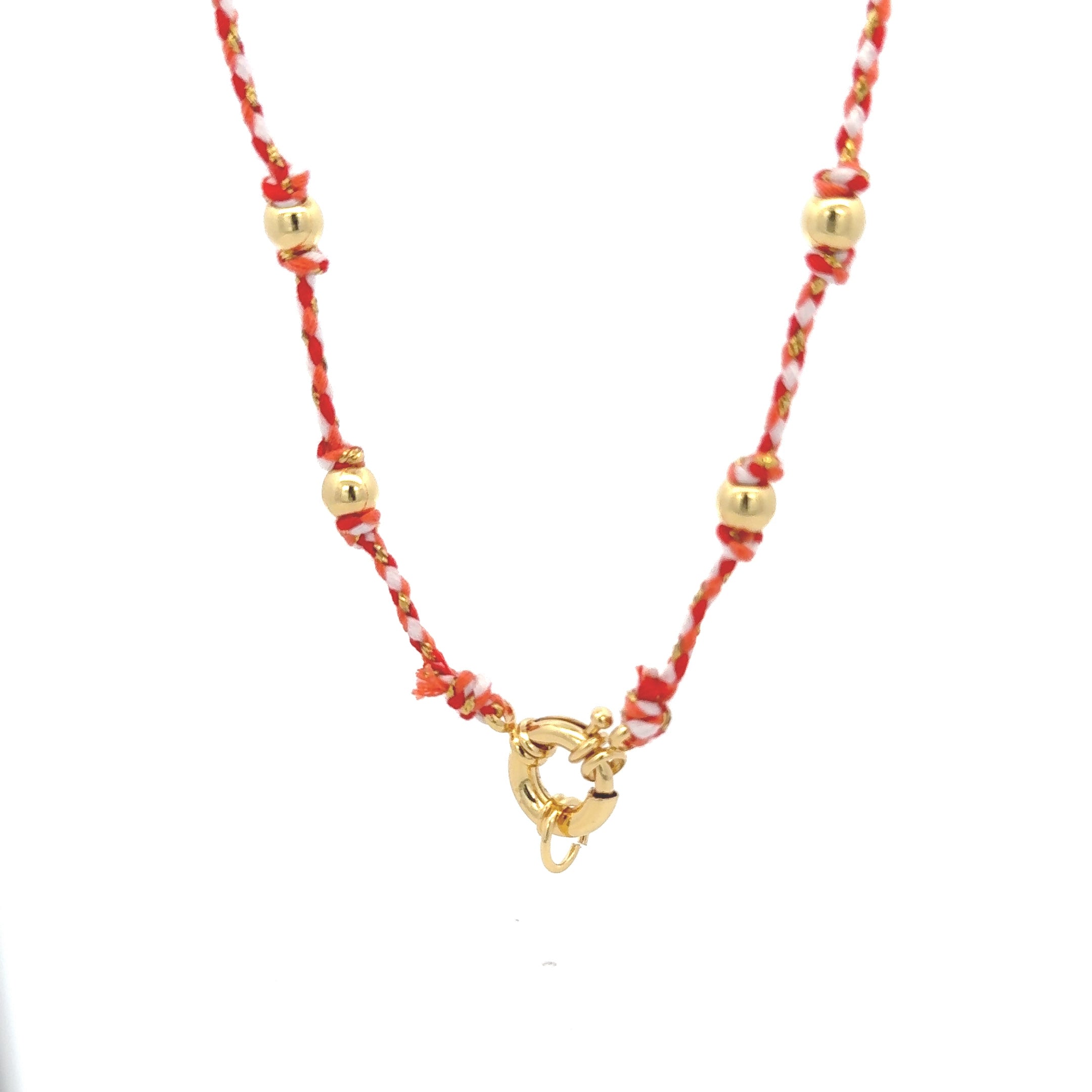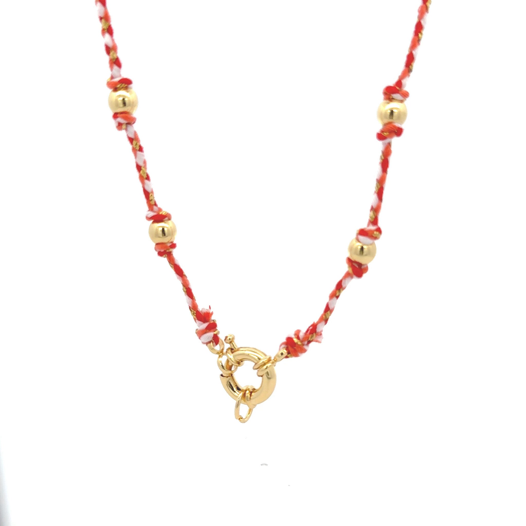 Ketting van turquoise met donkerblauw koord en een goudkleurige sluiting in het midden.