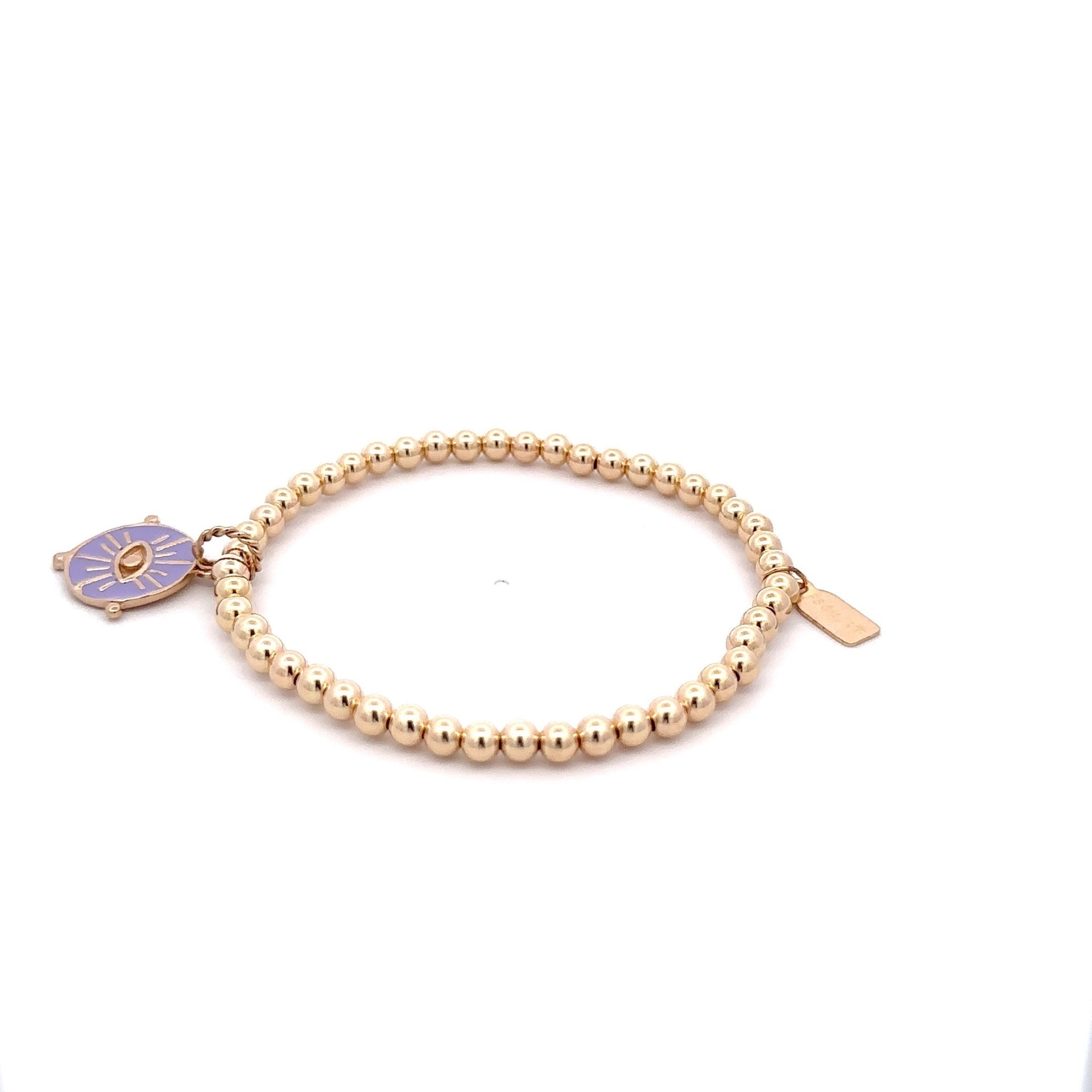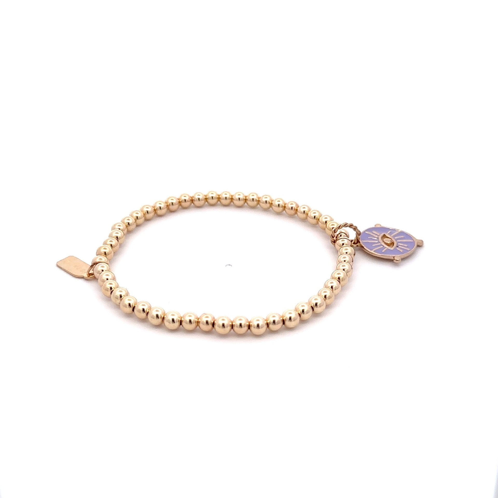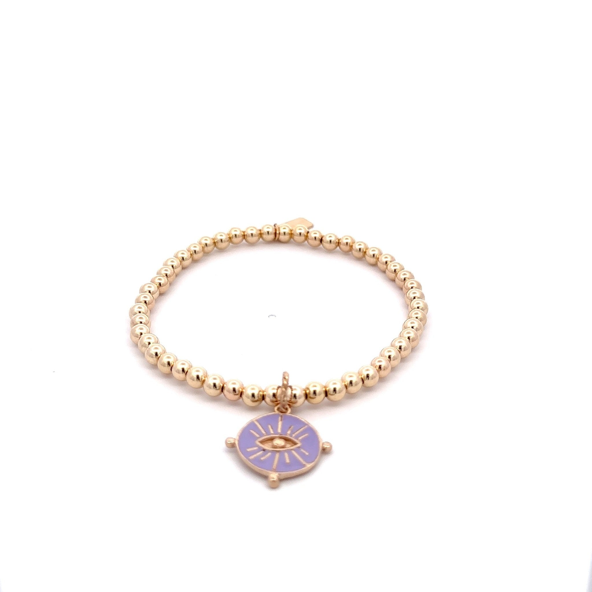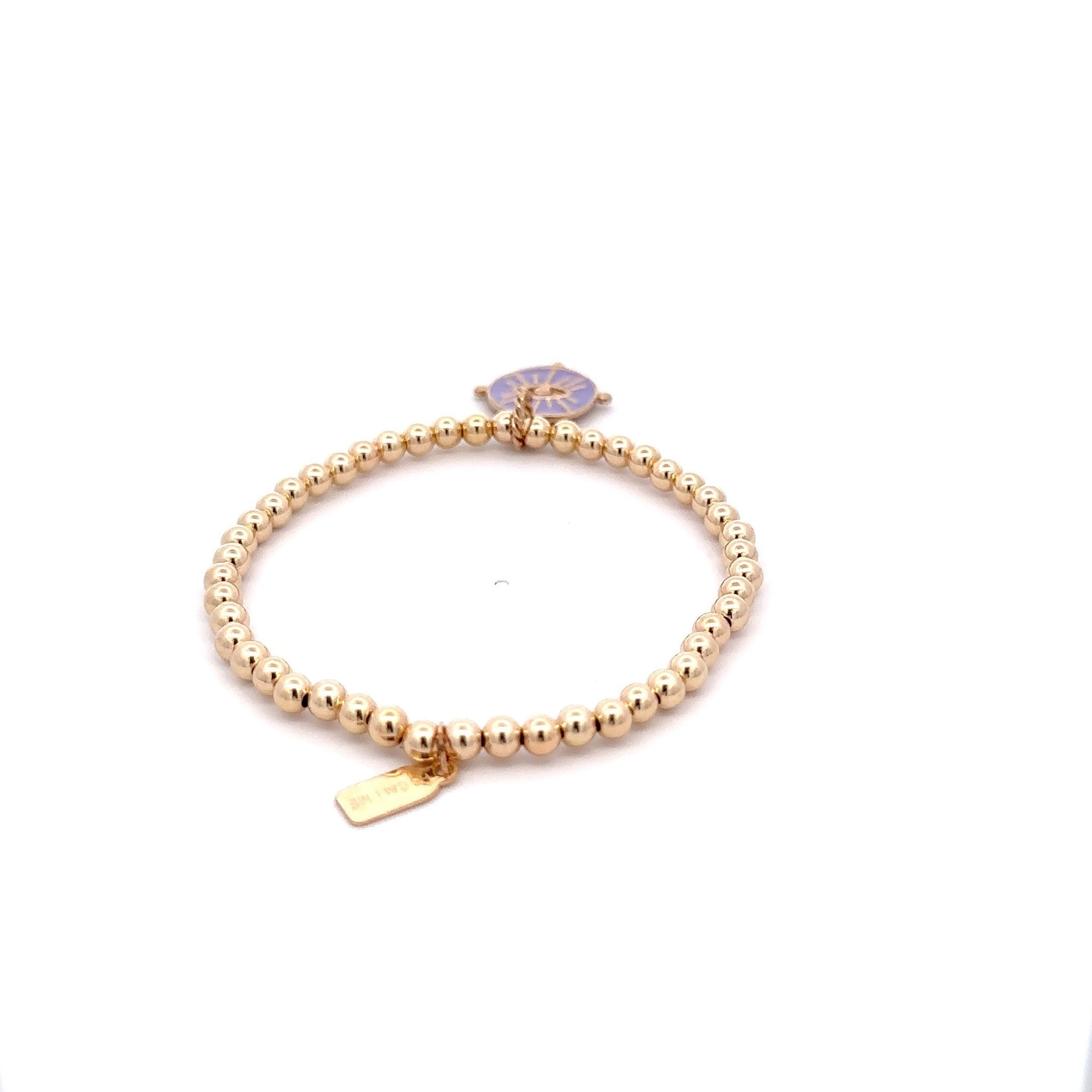 Elastische armband met goudkleurige bolletjes en een ronde, gekleurde hanger met oogje.
