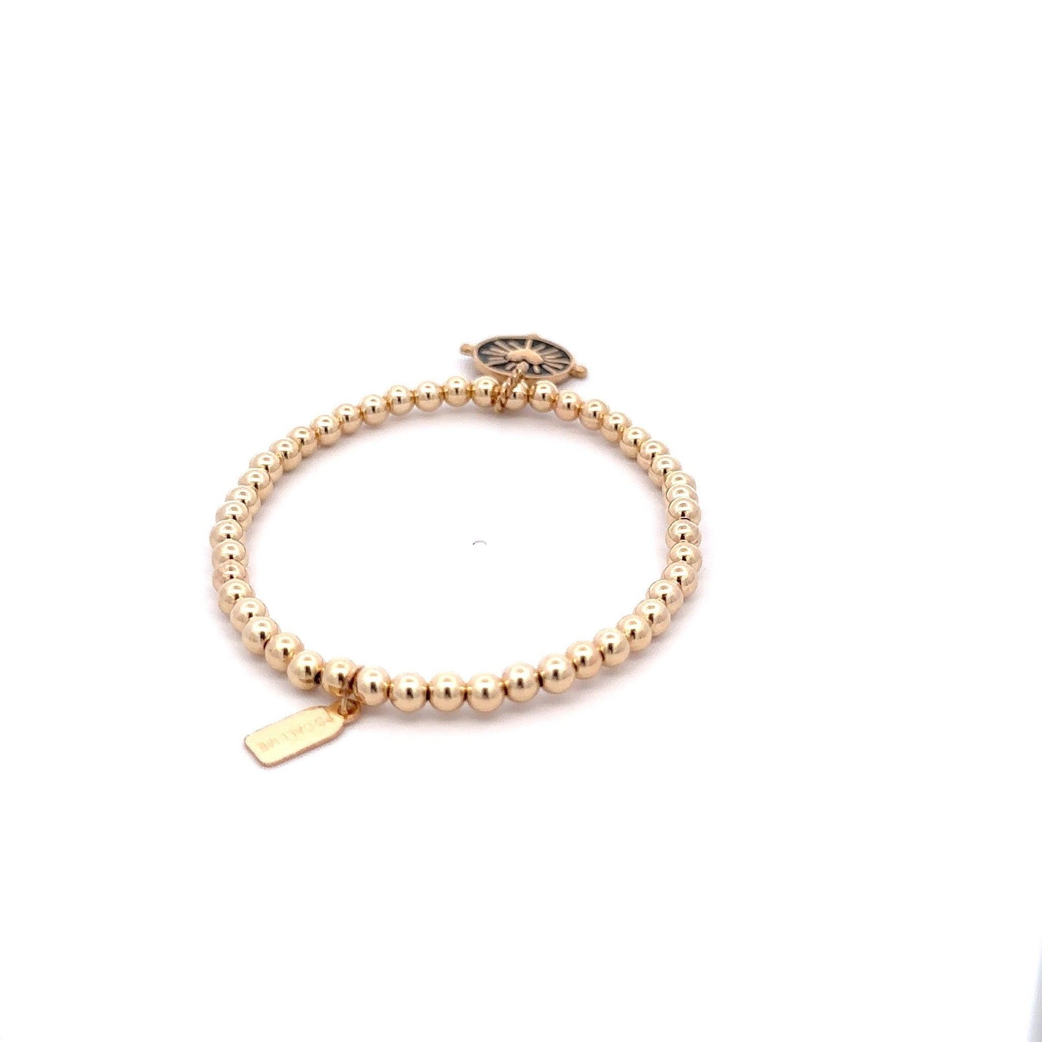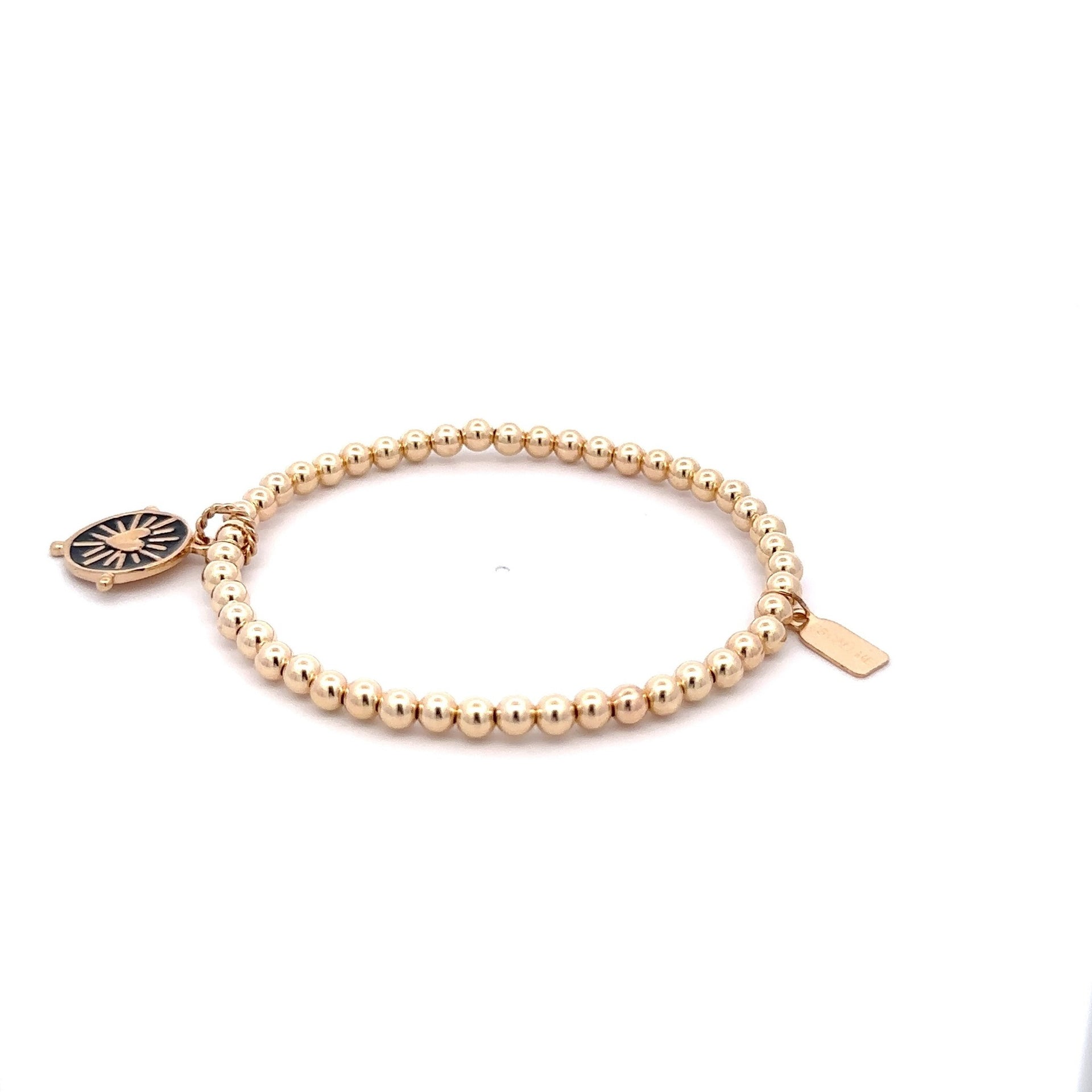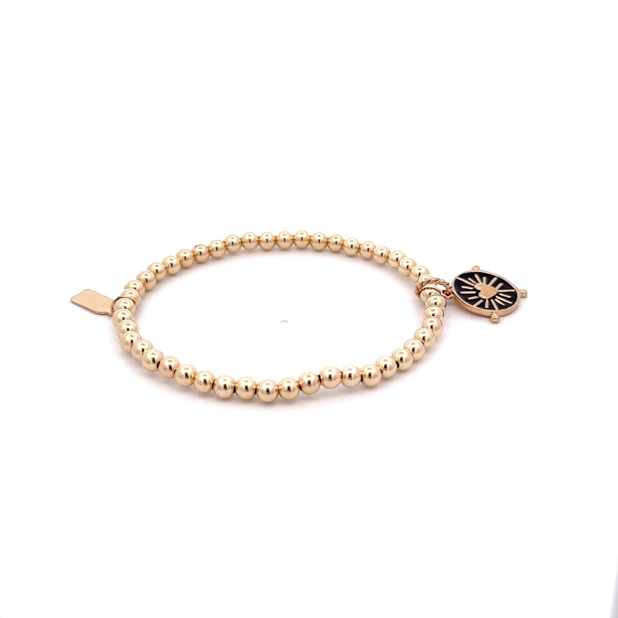 Elastische armband met goudkleurige bolletjes en een ronde, gekleurde hanger met een hartje.