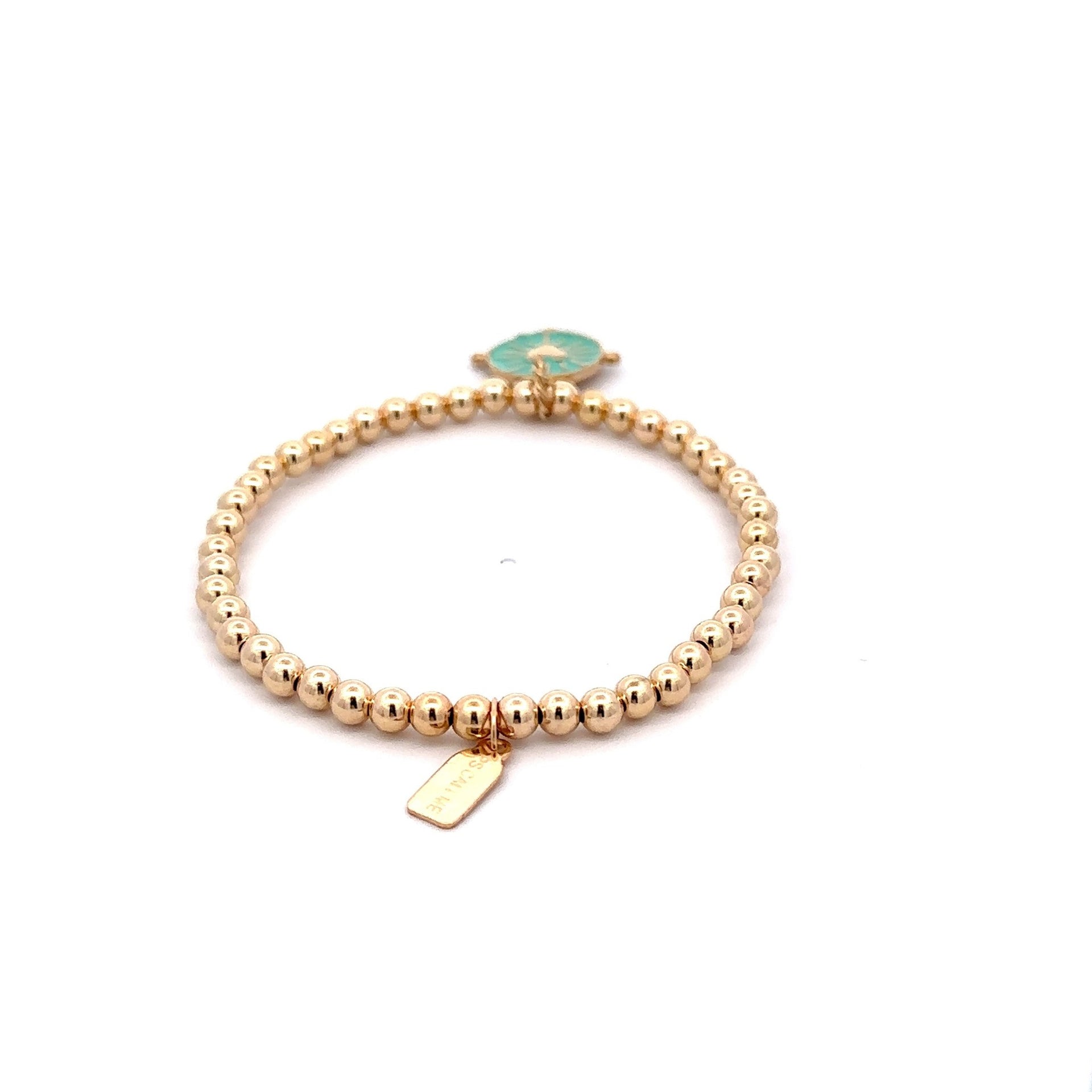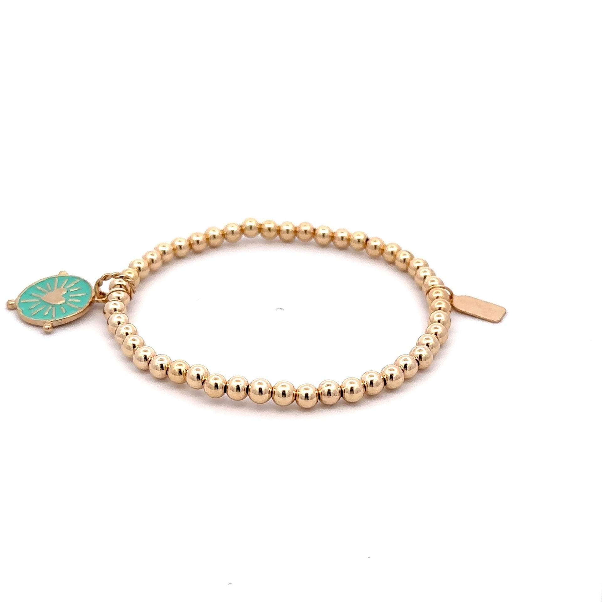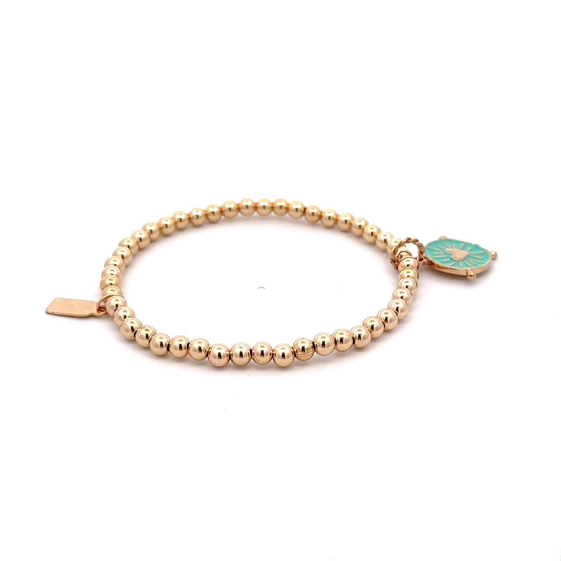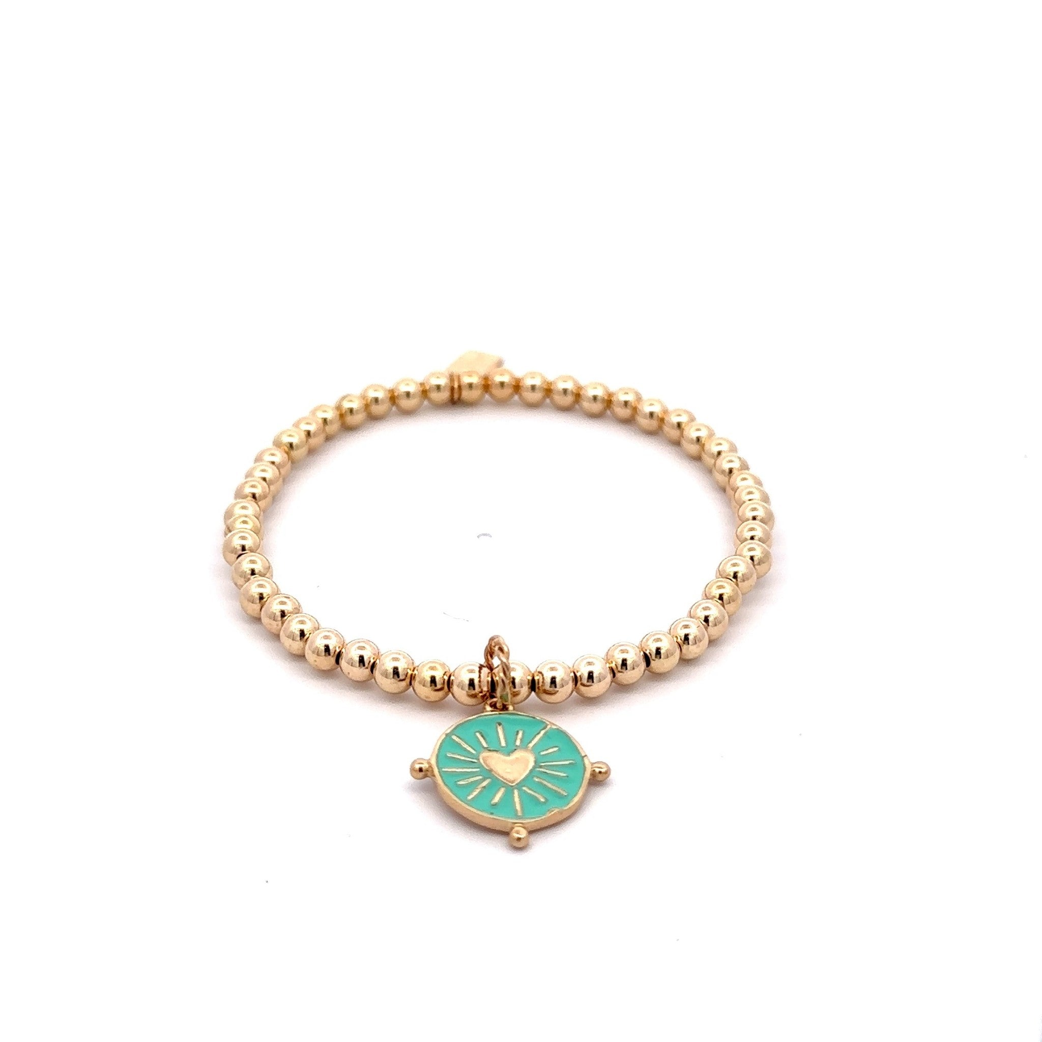 Elastische armband met goudkleurige bolletjes en een ronde, gekleurde hanger met een hartje.