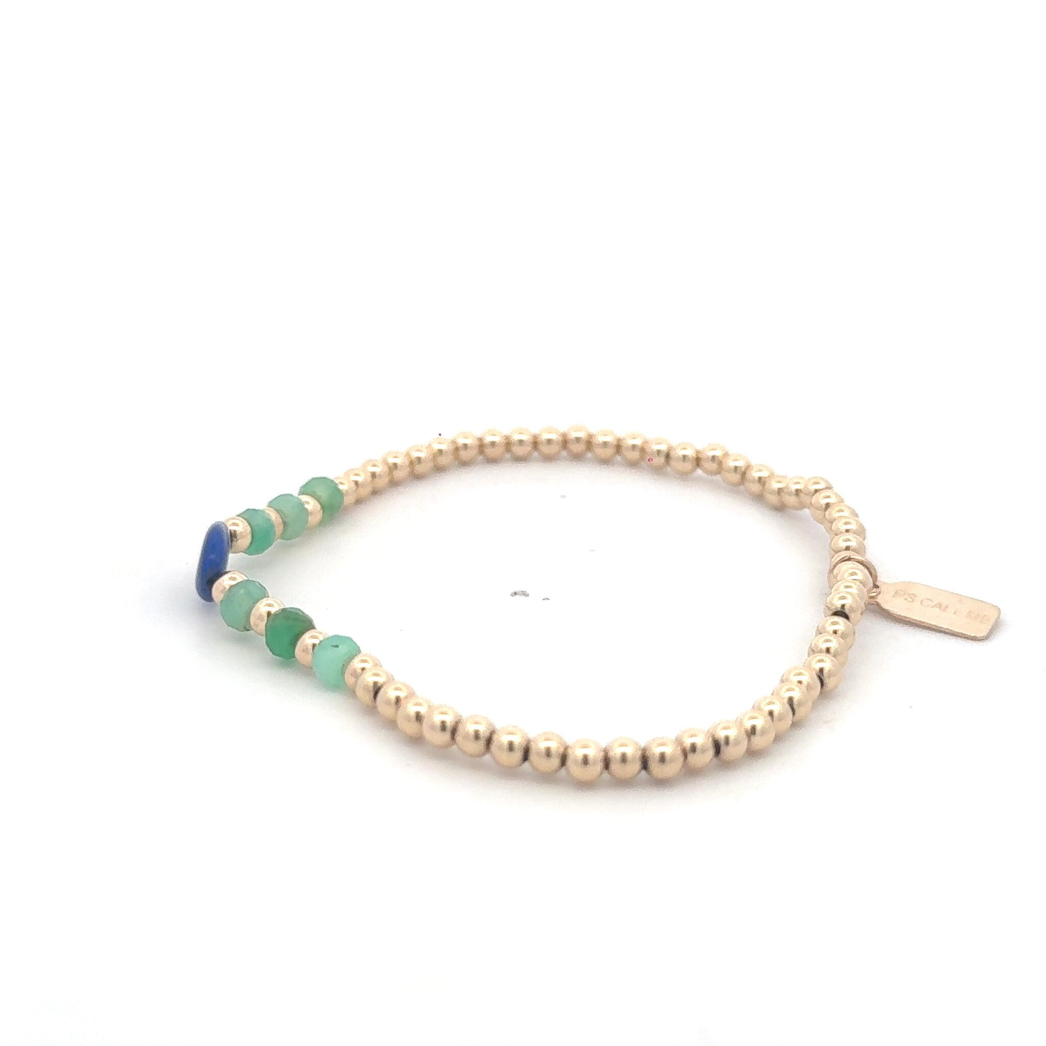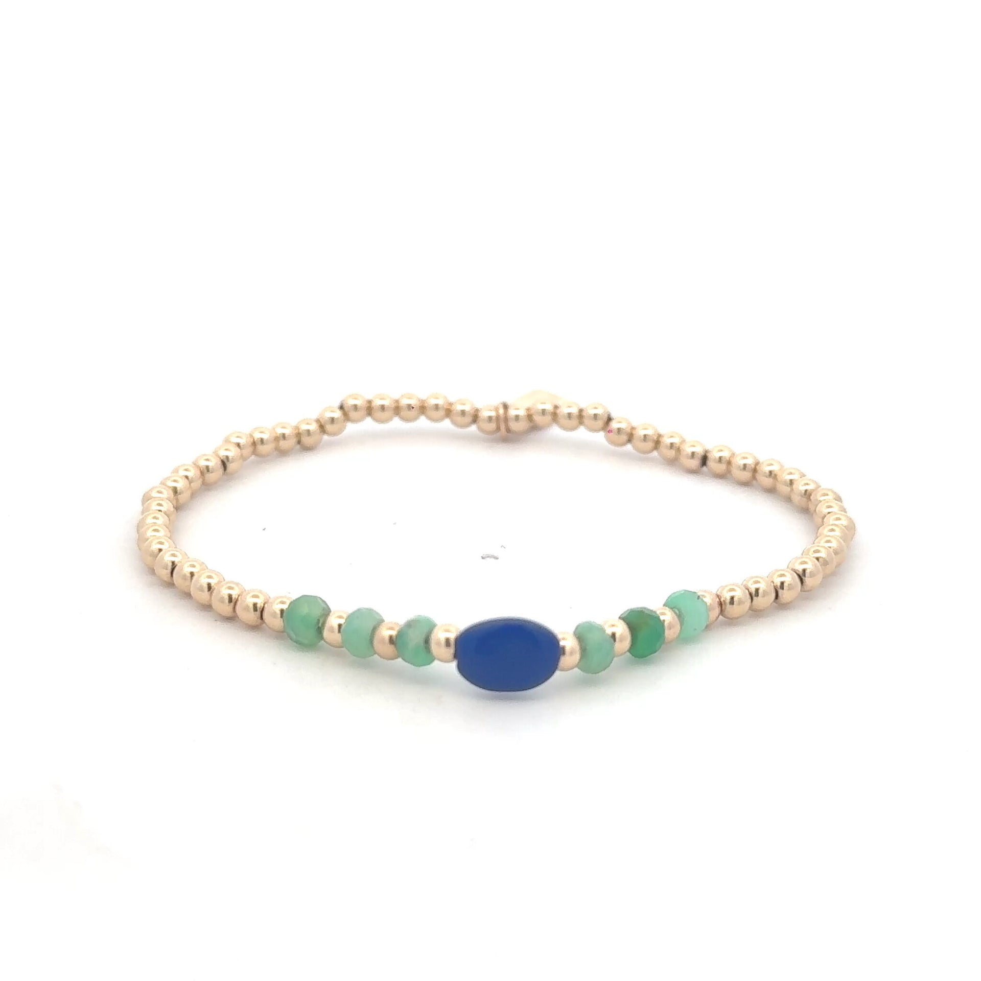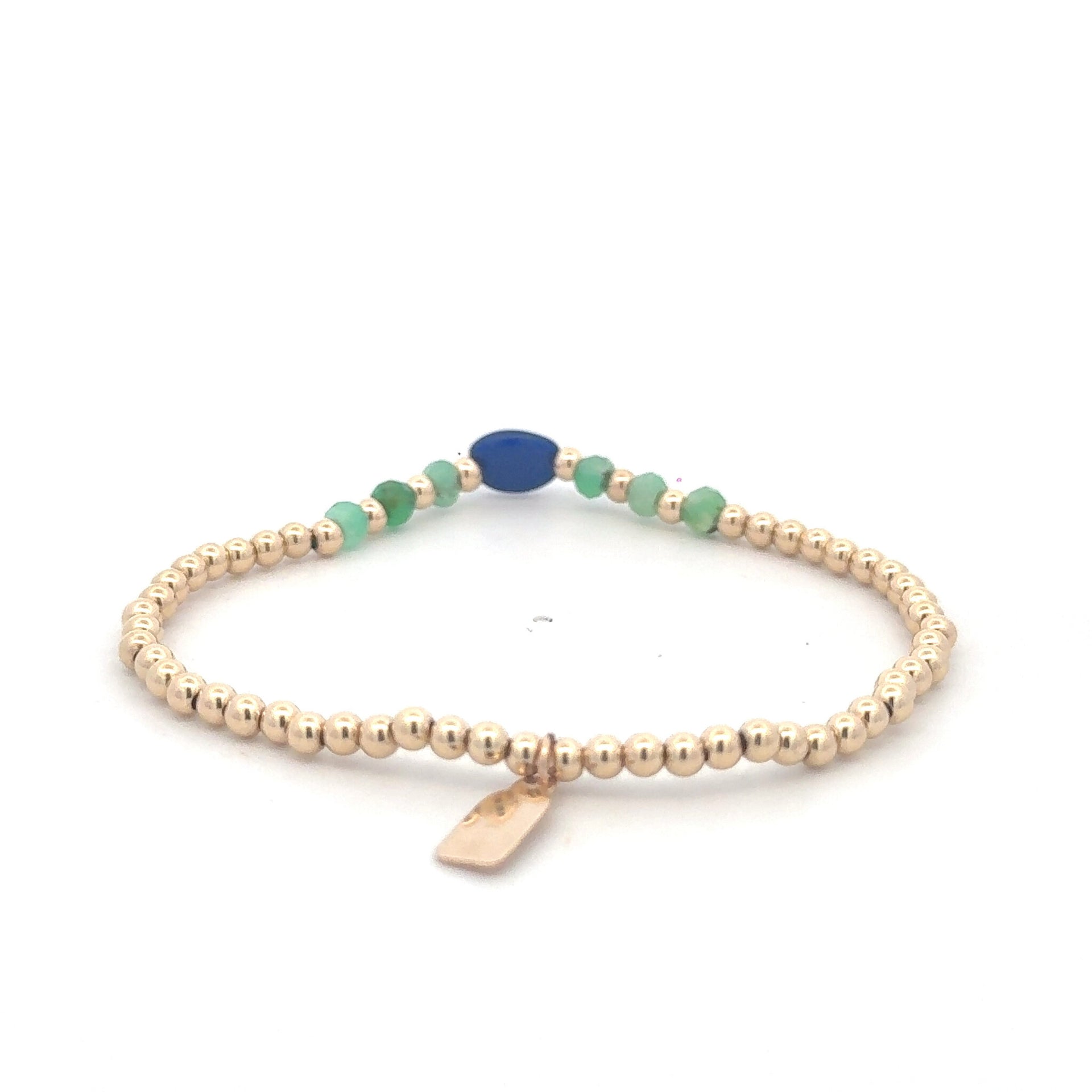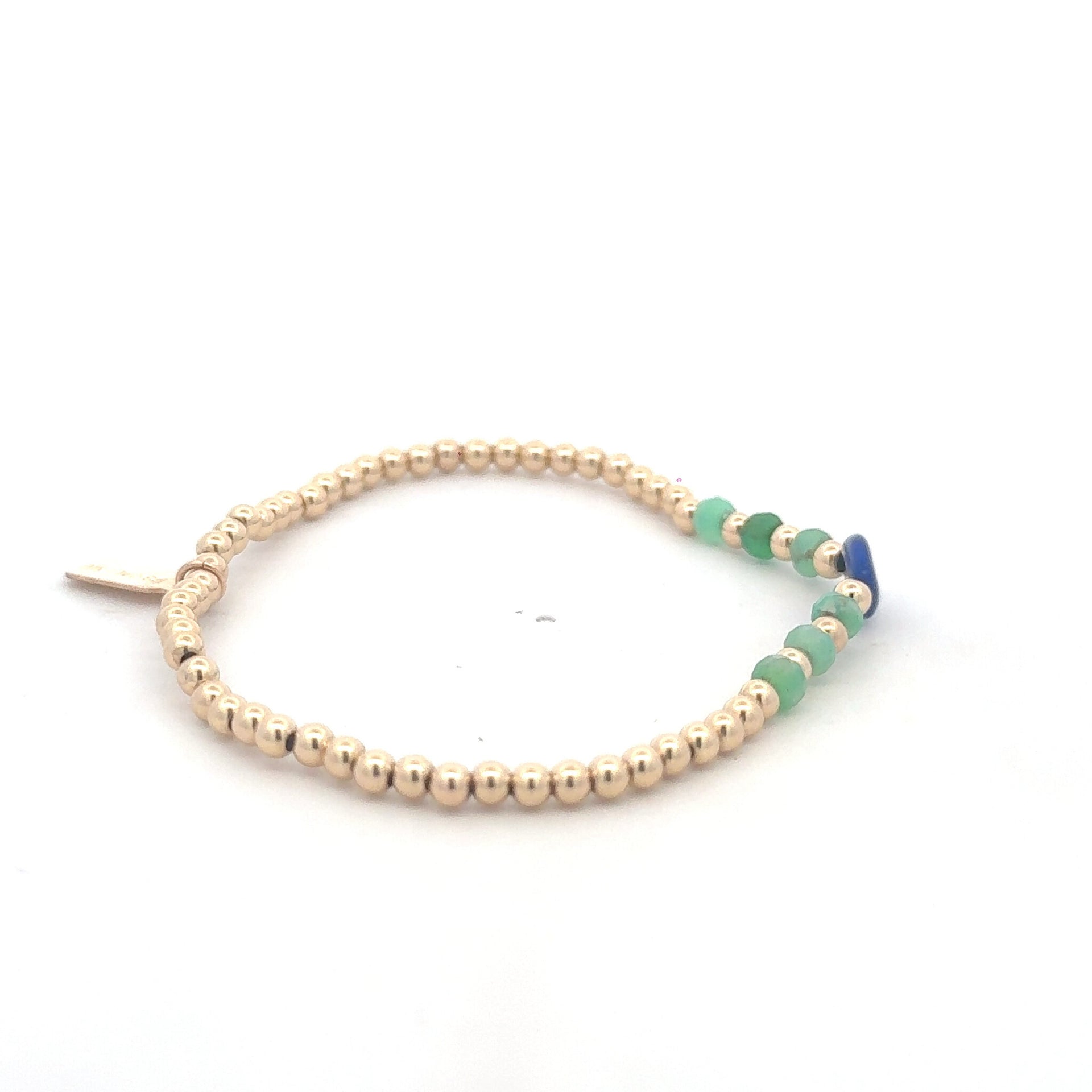 Elastic bracelet with gold colored balls and a row of colored stones.