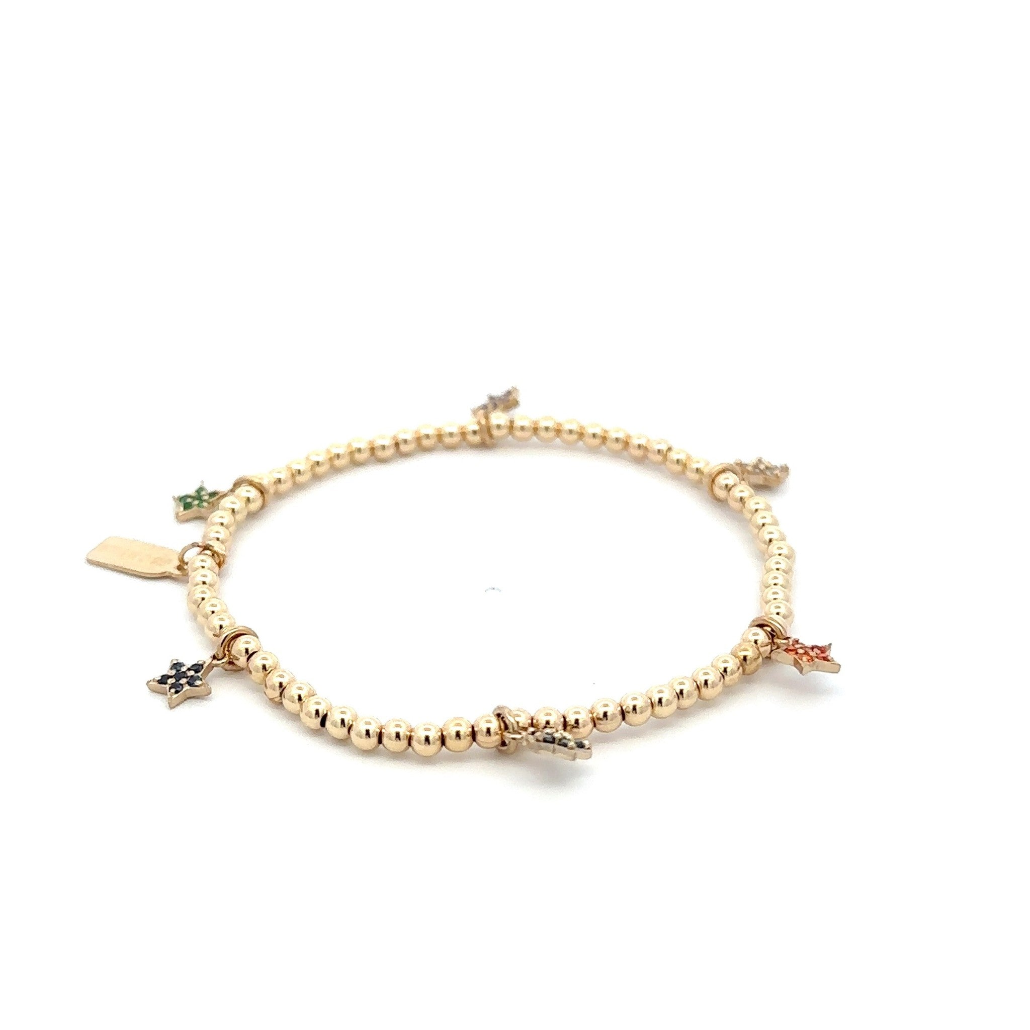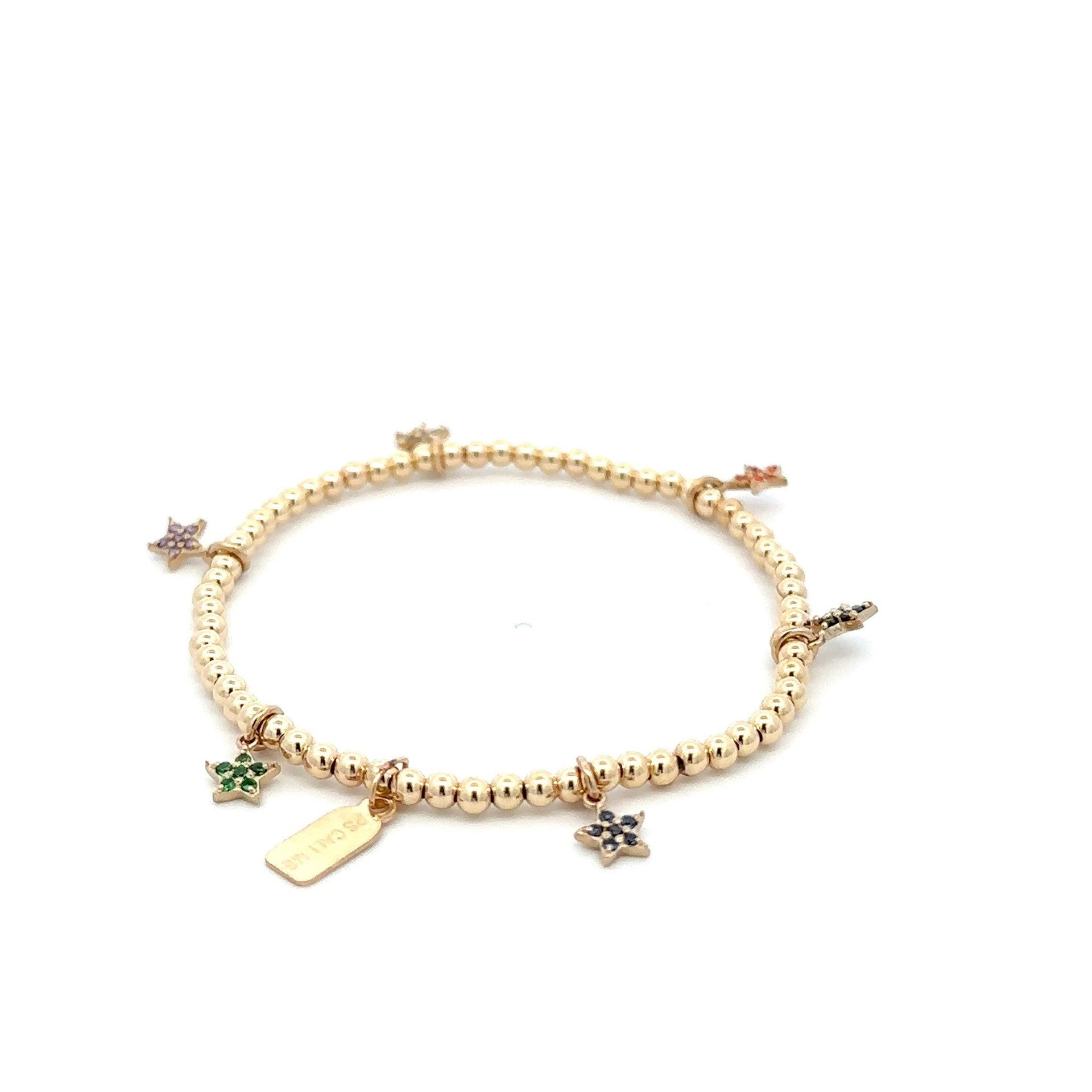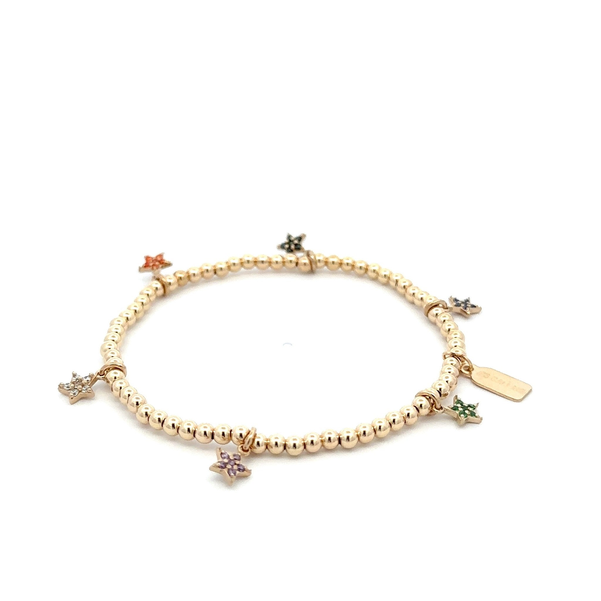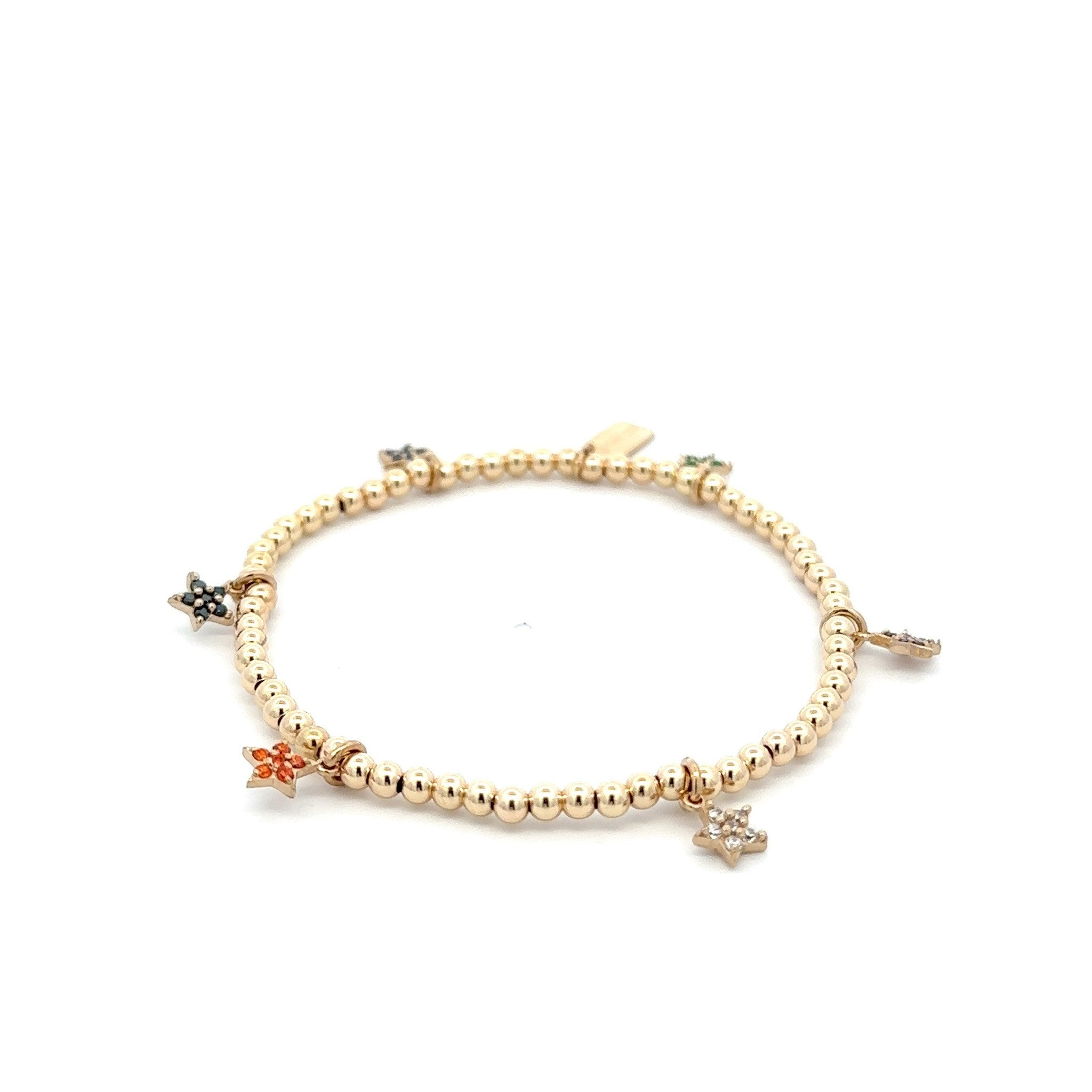 Elastische armband met goudkleurige balletjes en gekleurde sterbedels.