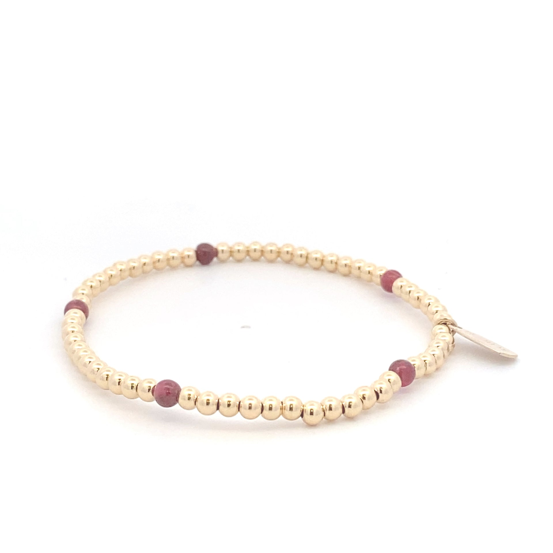 Elastic bracelet with gold colored balls and 5 colored burgundy stones.