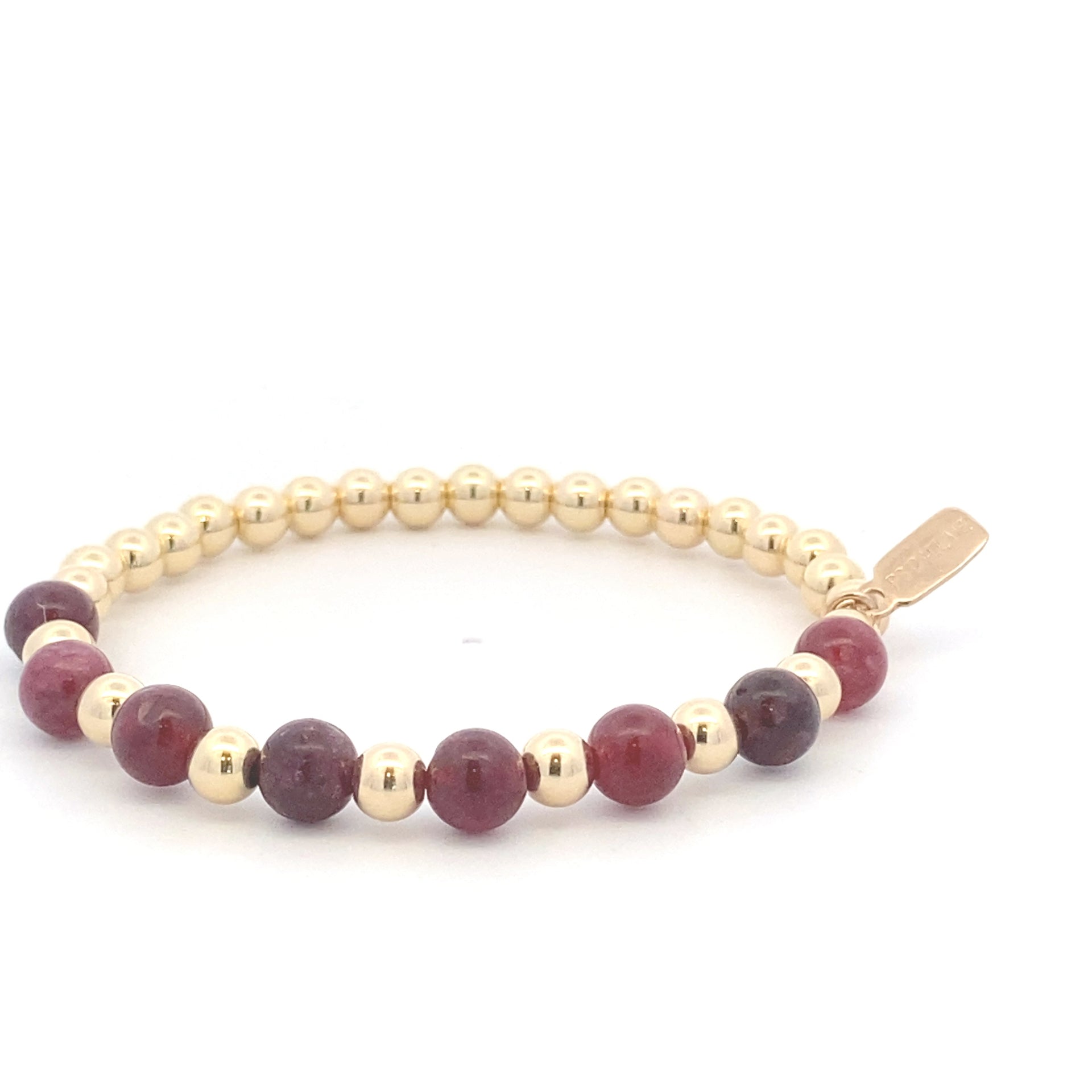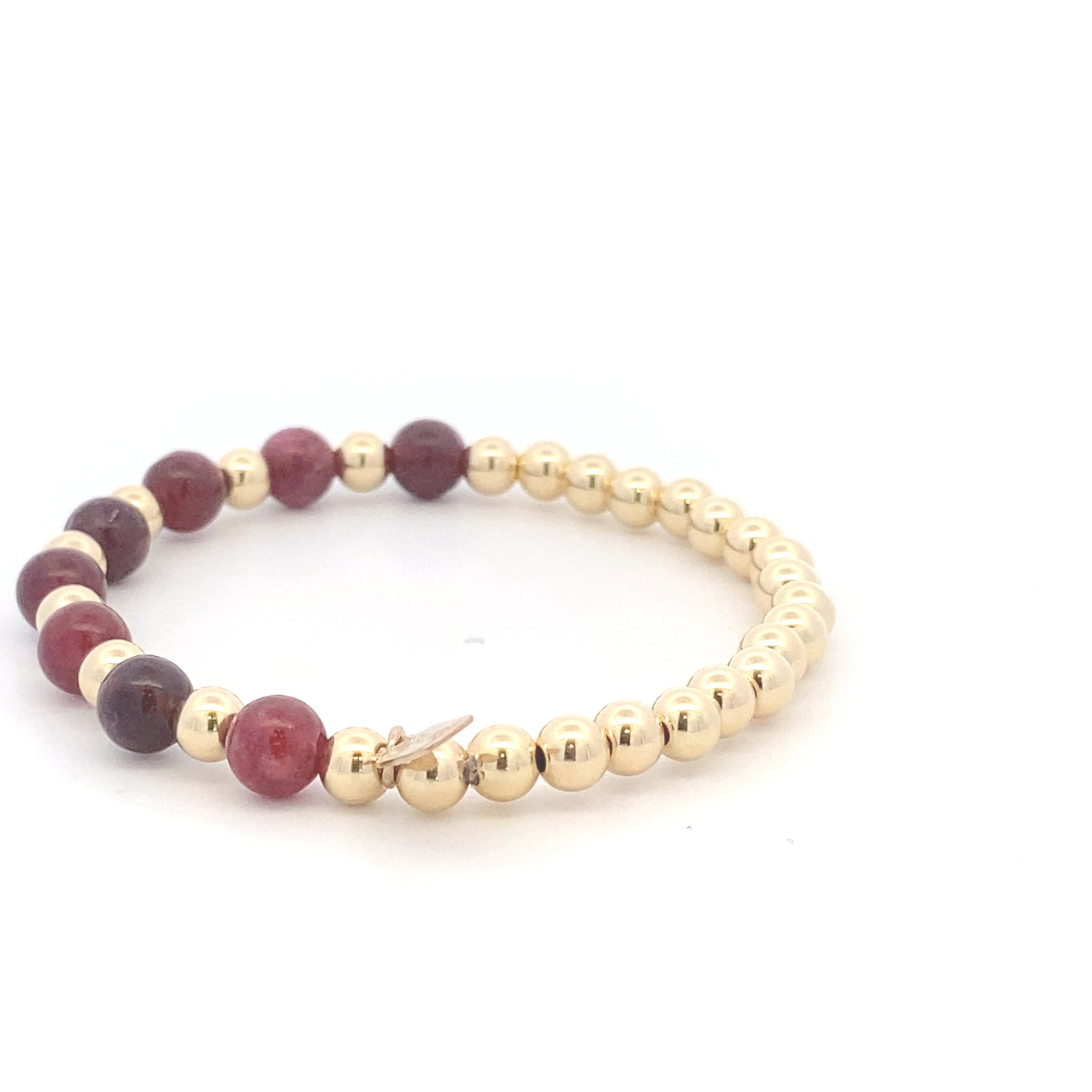 Elastic bracelet with gold colored balls and half mixed with burgundy beads.