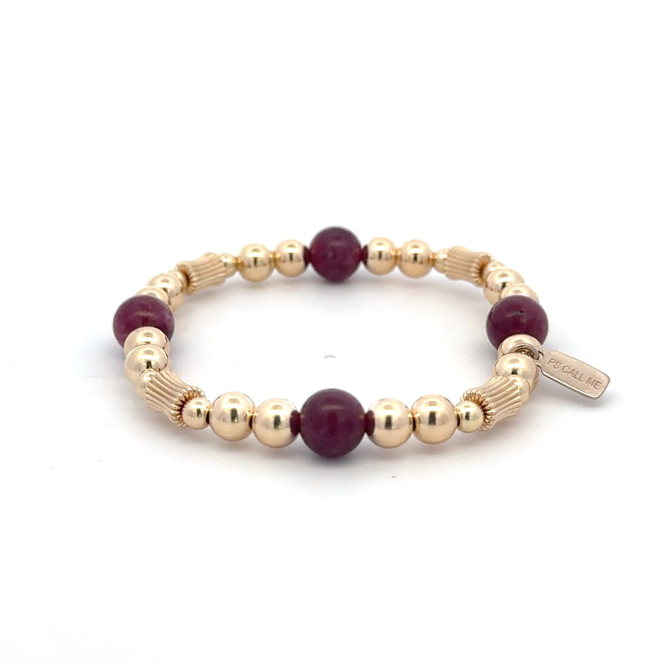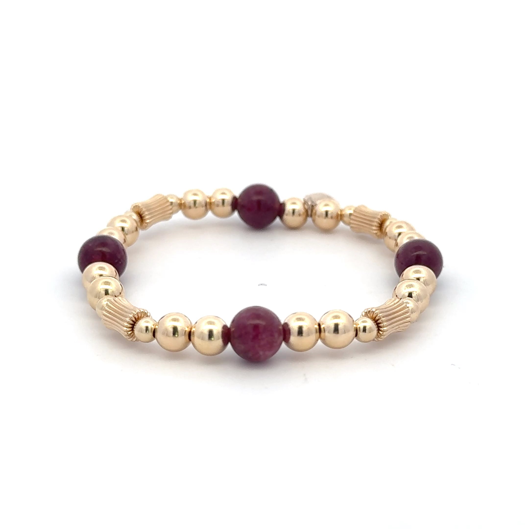 Elastic bracelet with bus ribbel, burgundy and gold colored beads