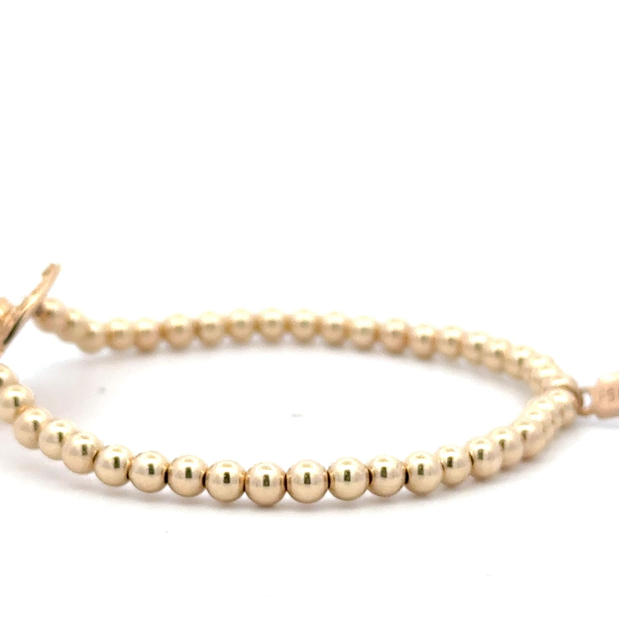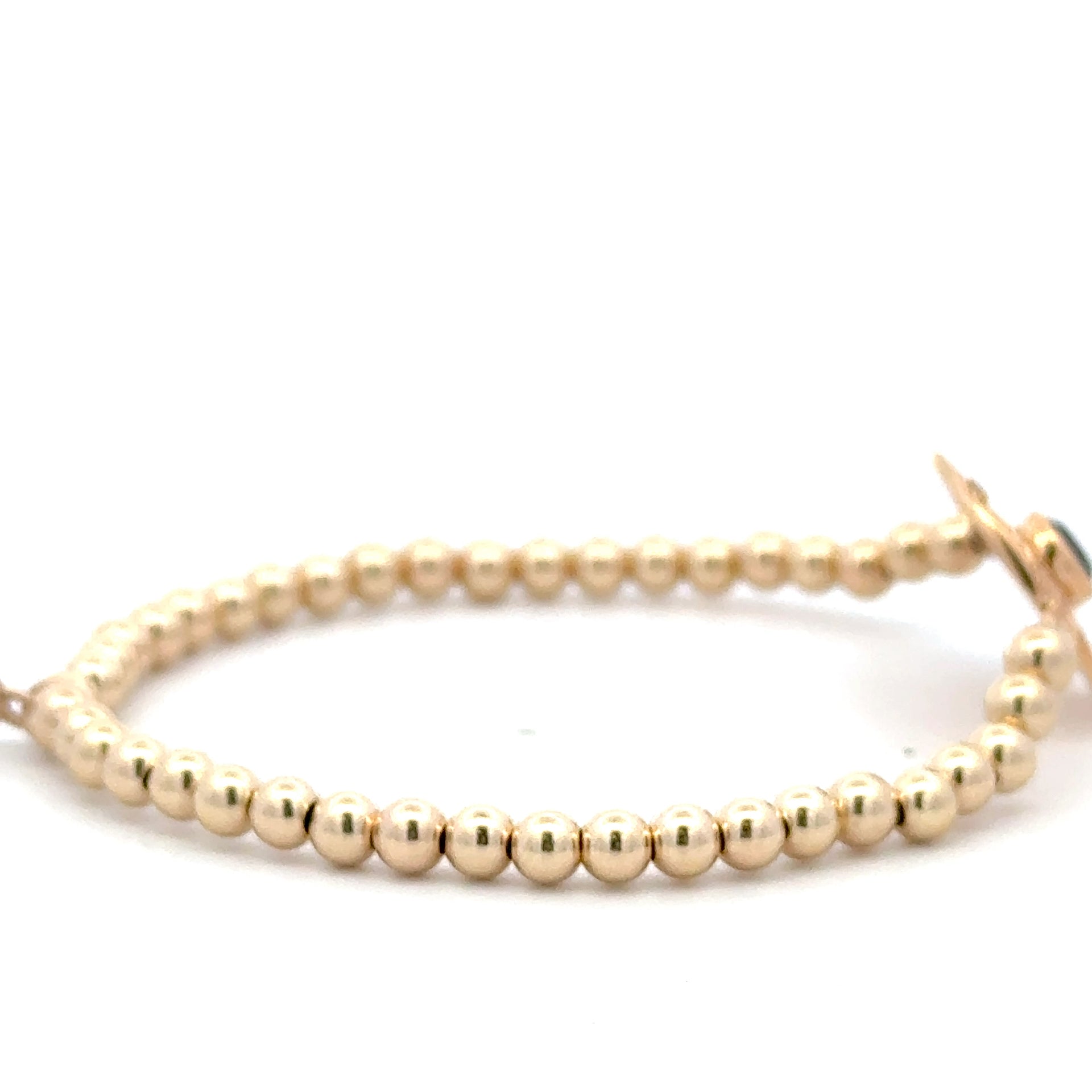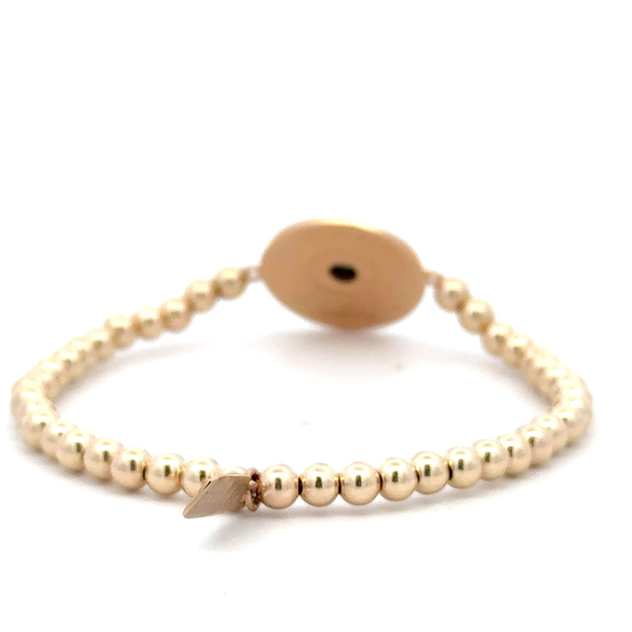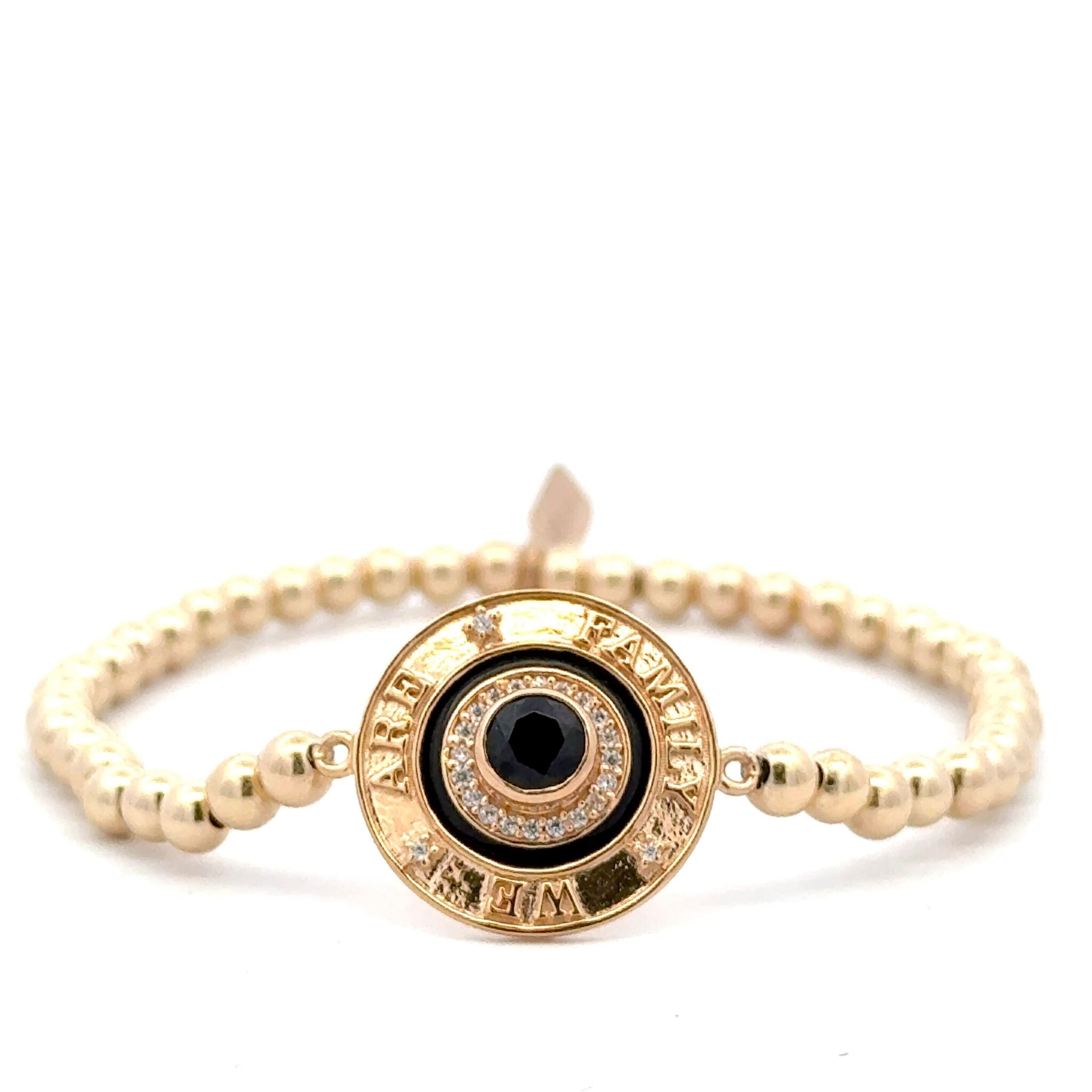 Elastic bracelet with gold colored balls and a large round coin charm with the text 'We are family' engraved all around and a colored black circle with a black stone in the middle.