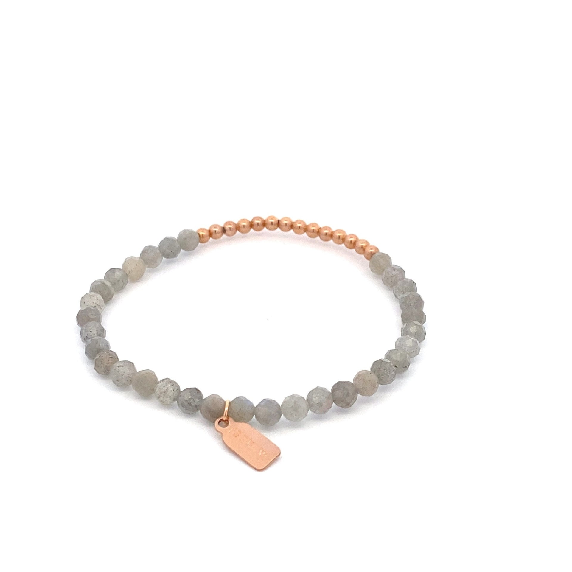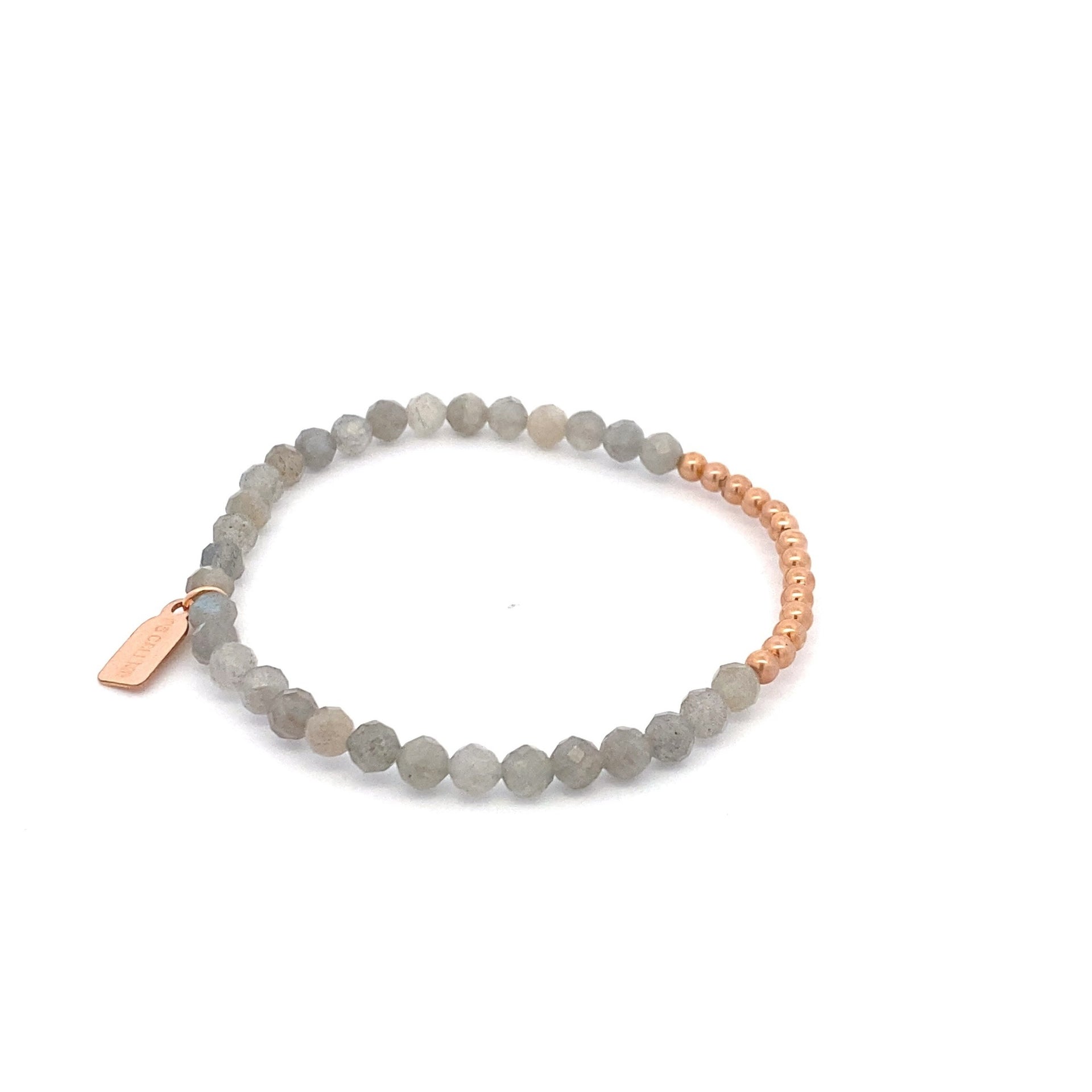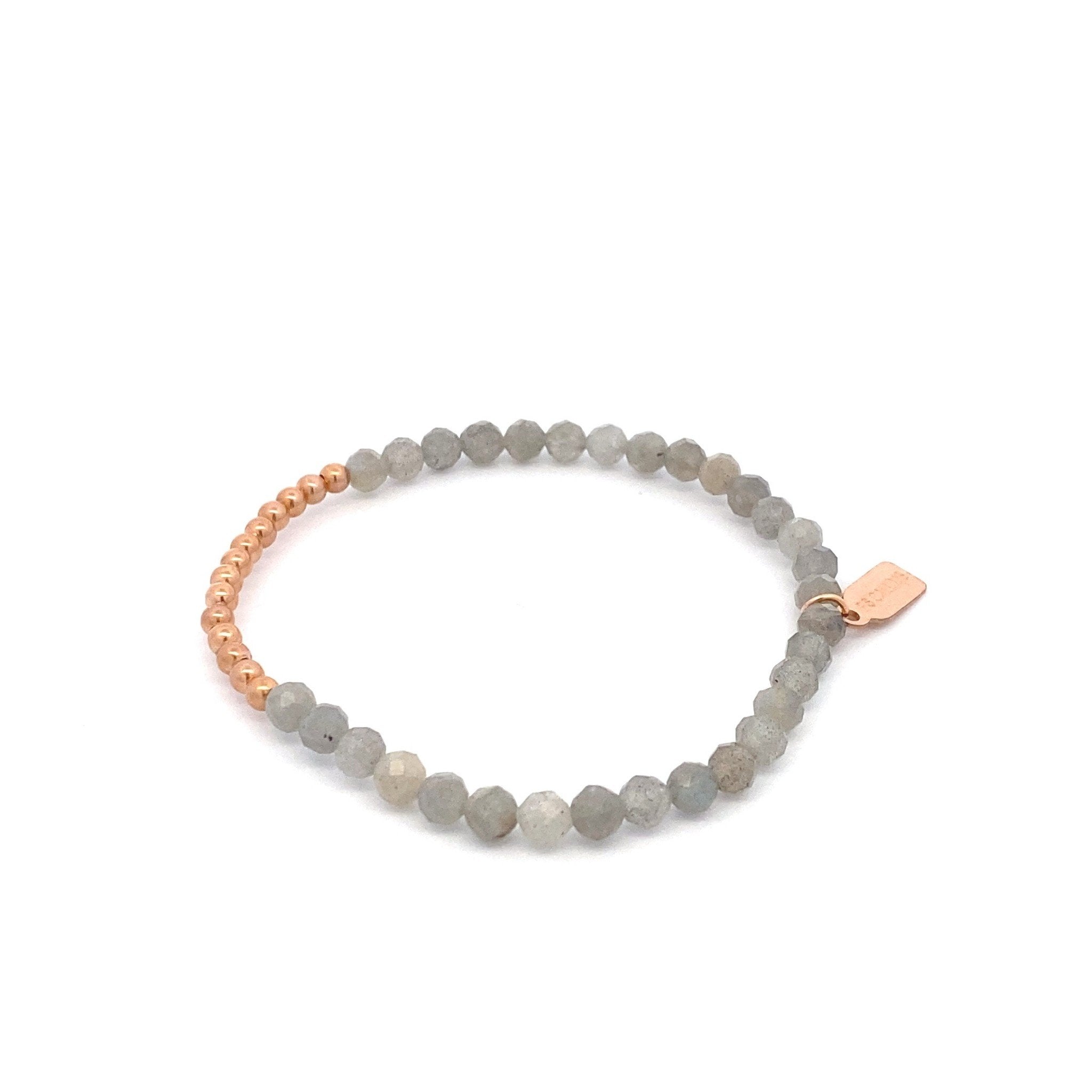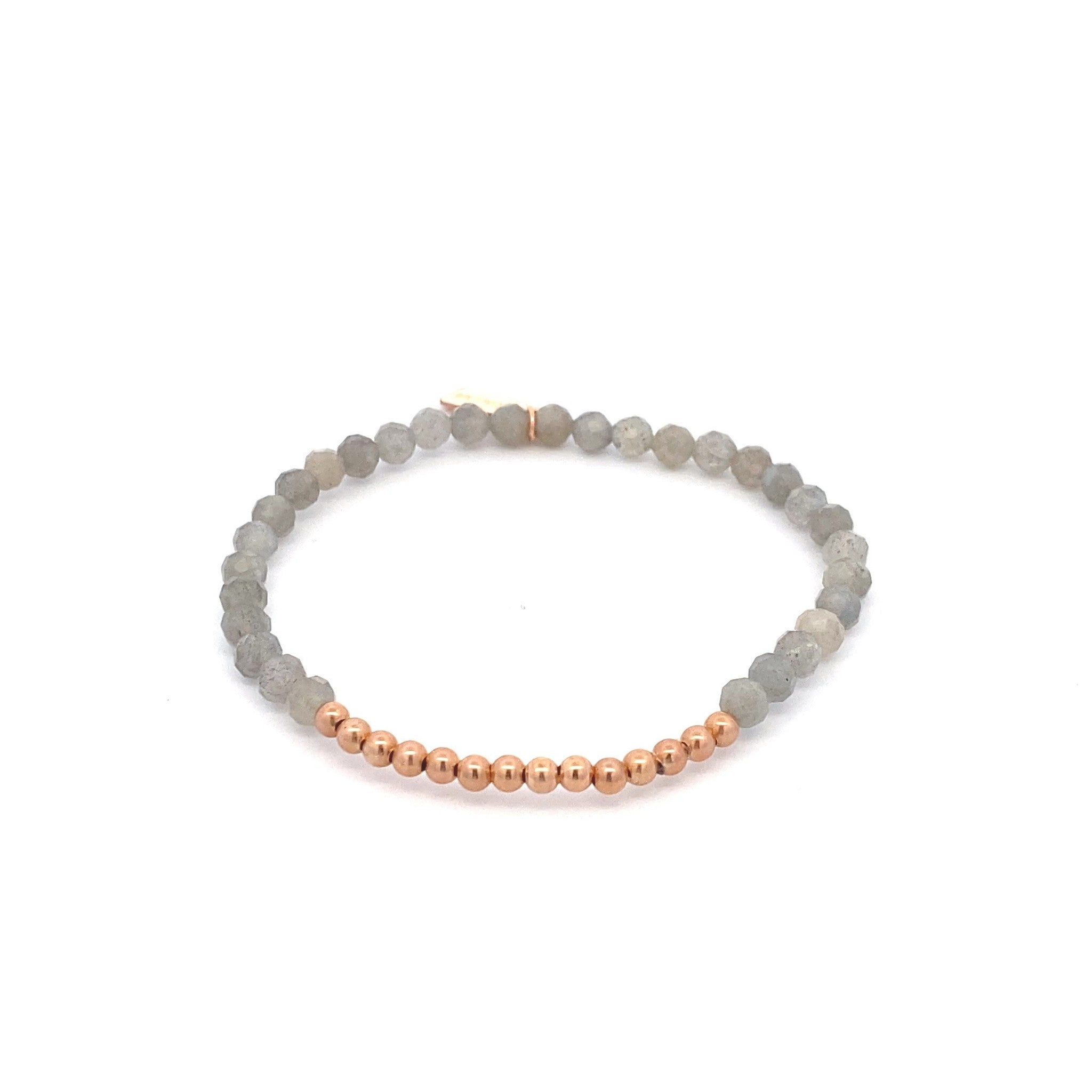 Elastic bracelet with colored stones and a row of rose gold balls.