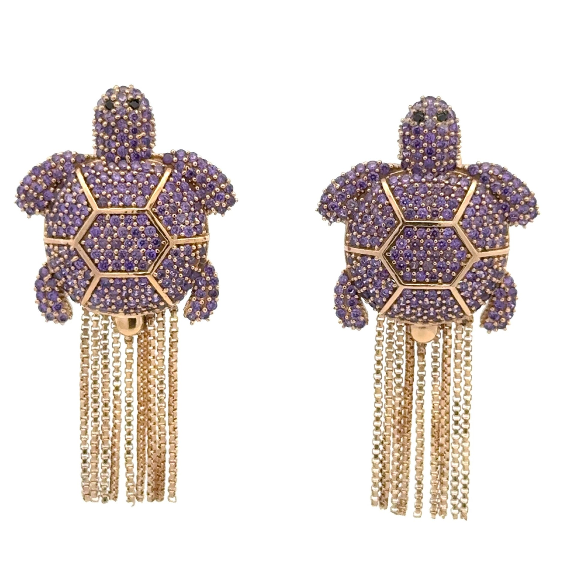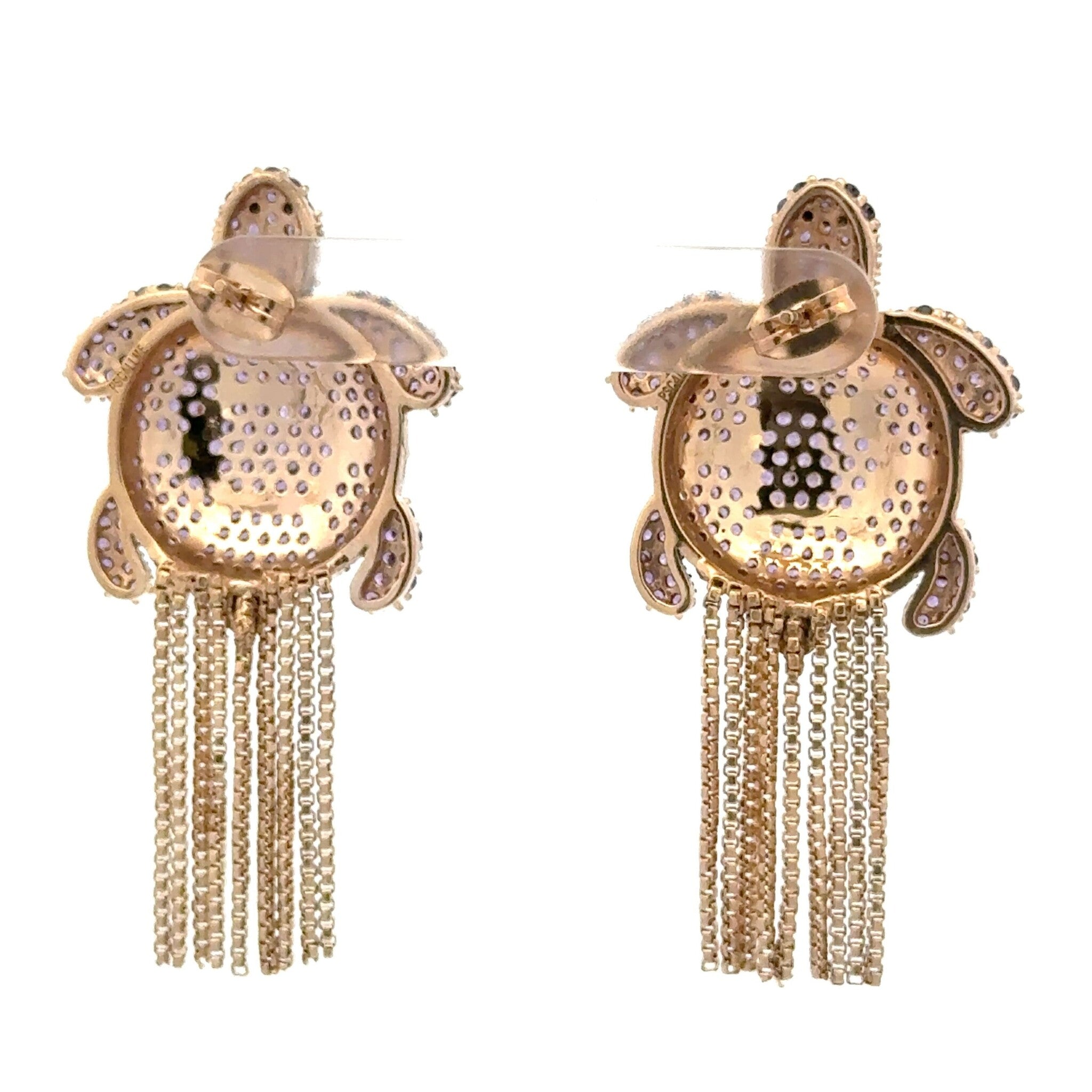 Gold-colored earrings with a turtle charm and fringes