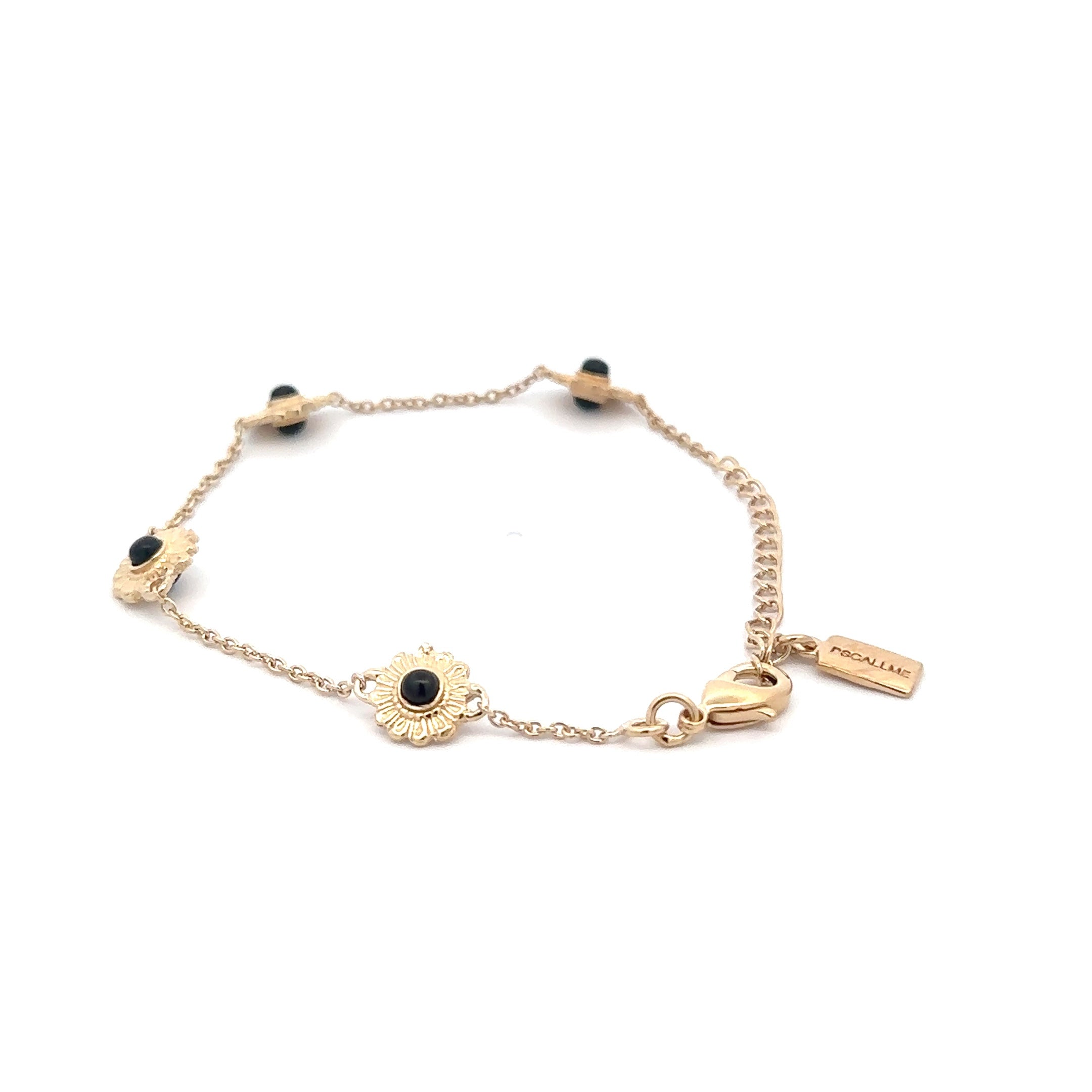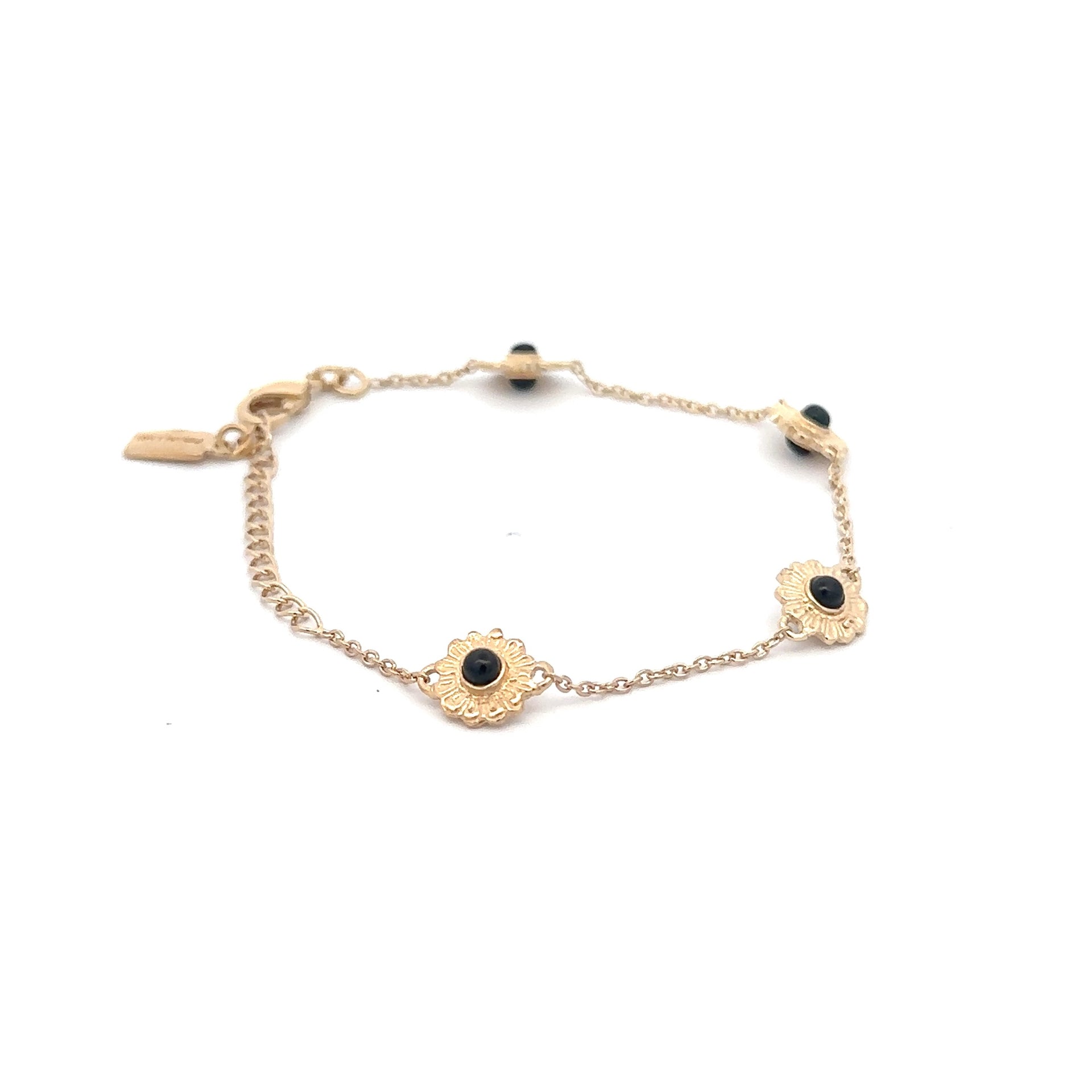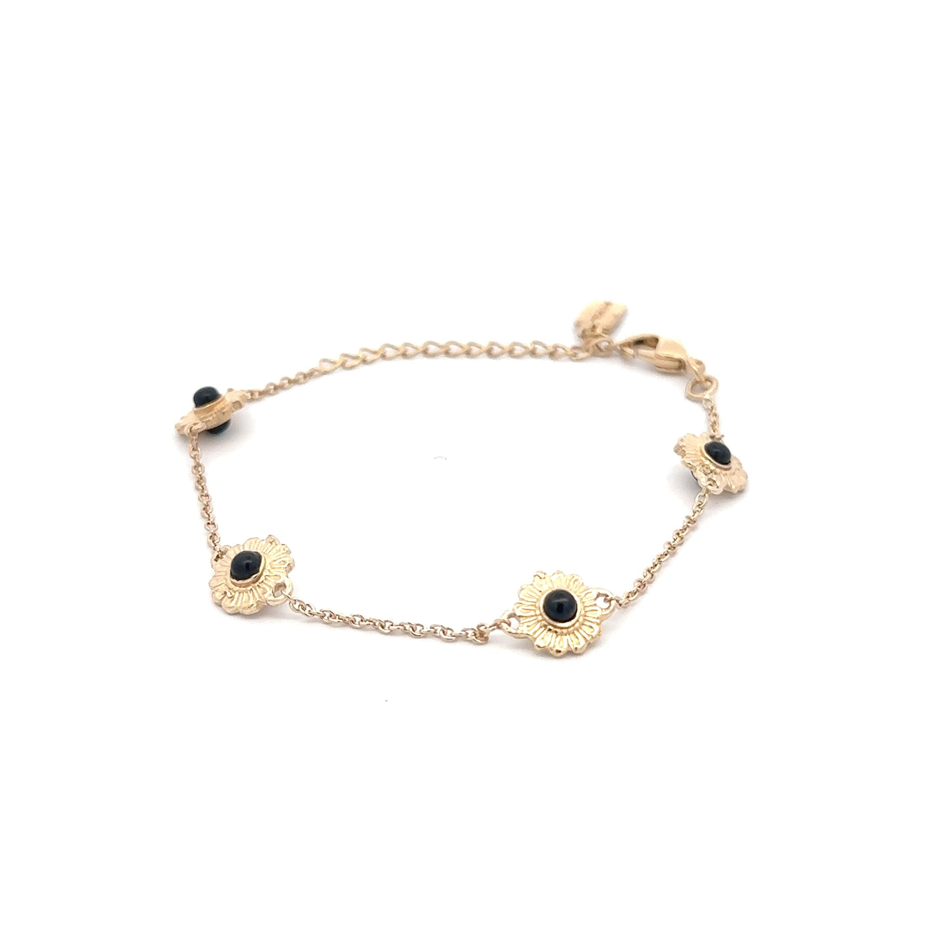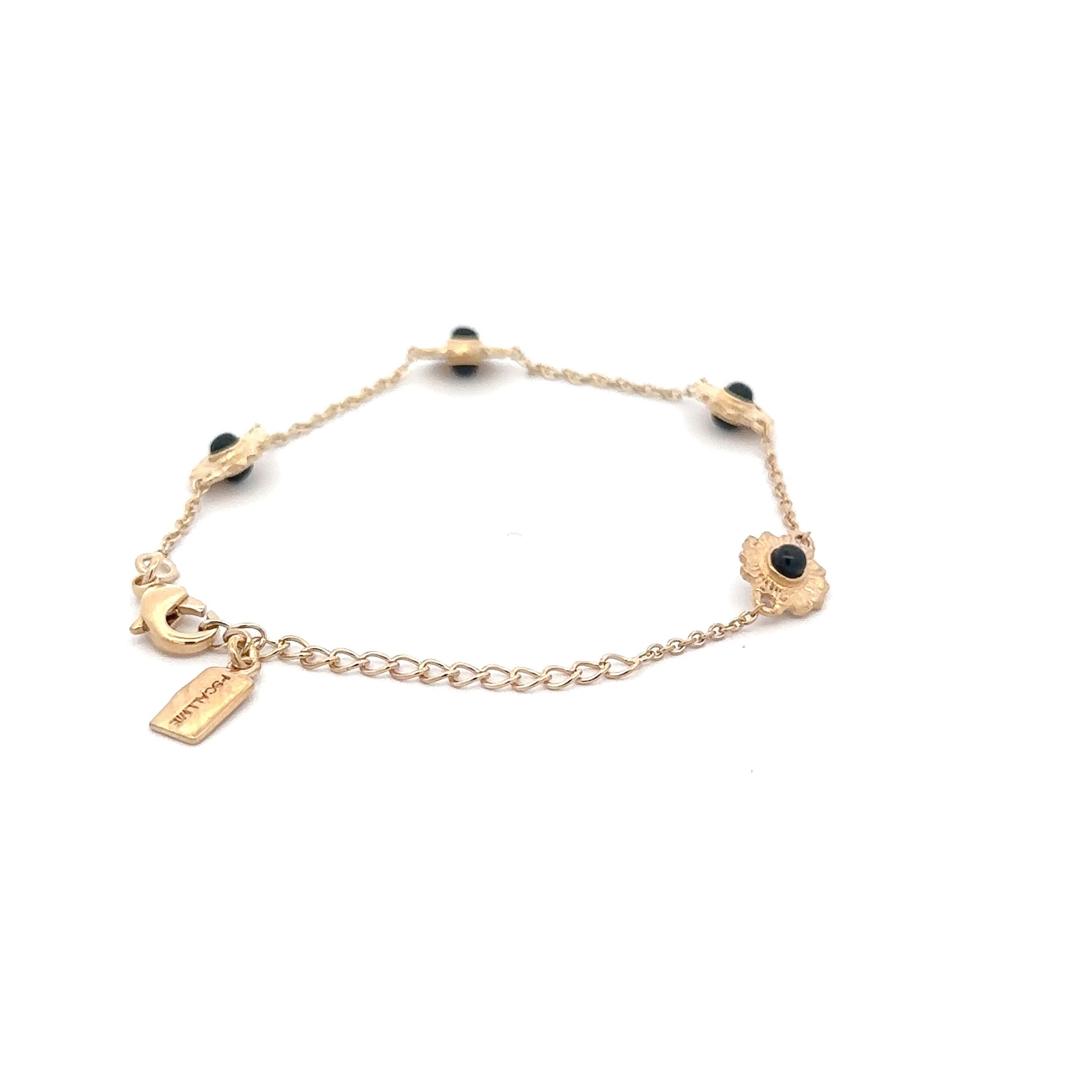 Gold-colored bracelet with flower charms and a colored stone in the center of each flower