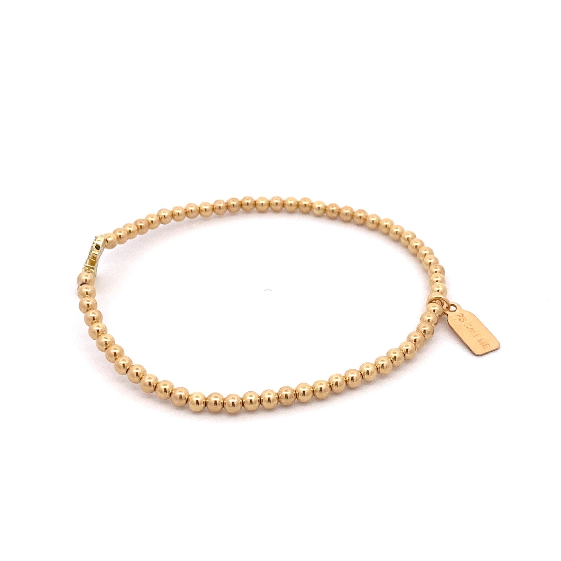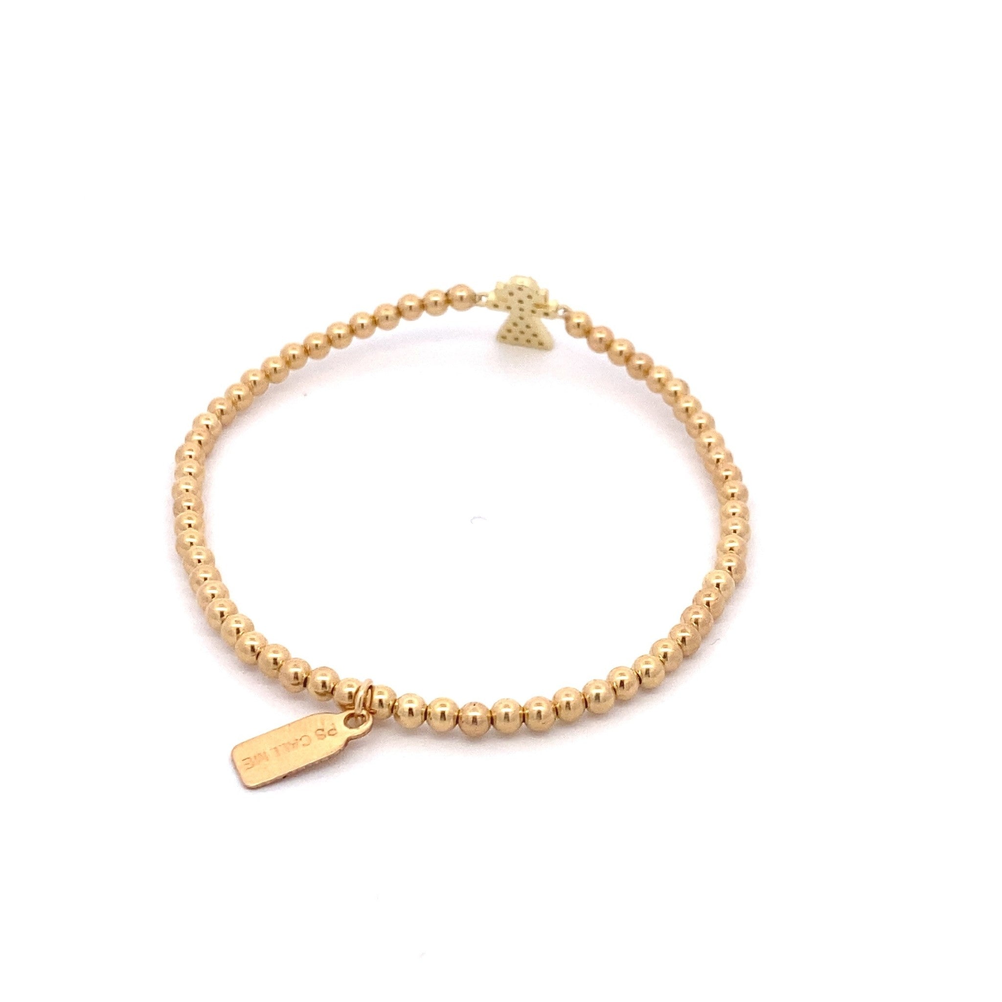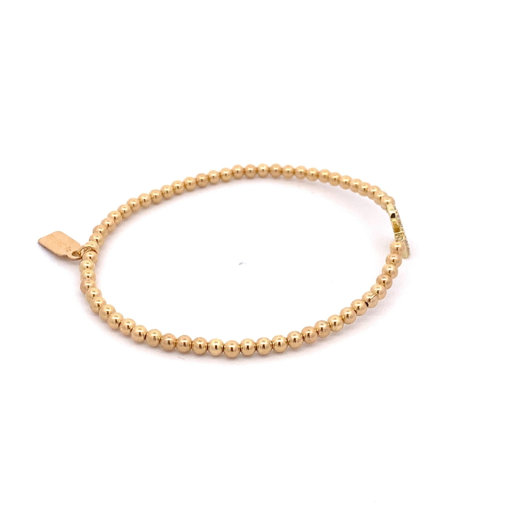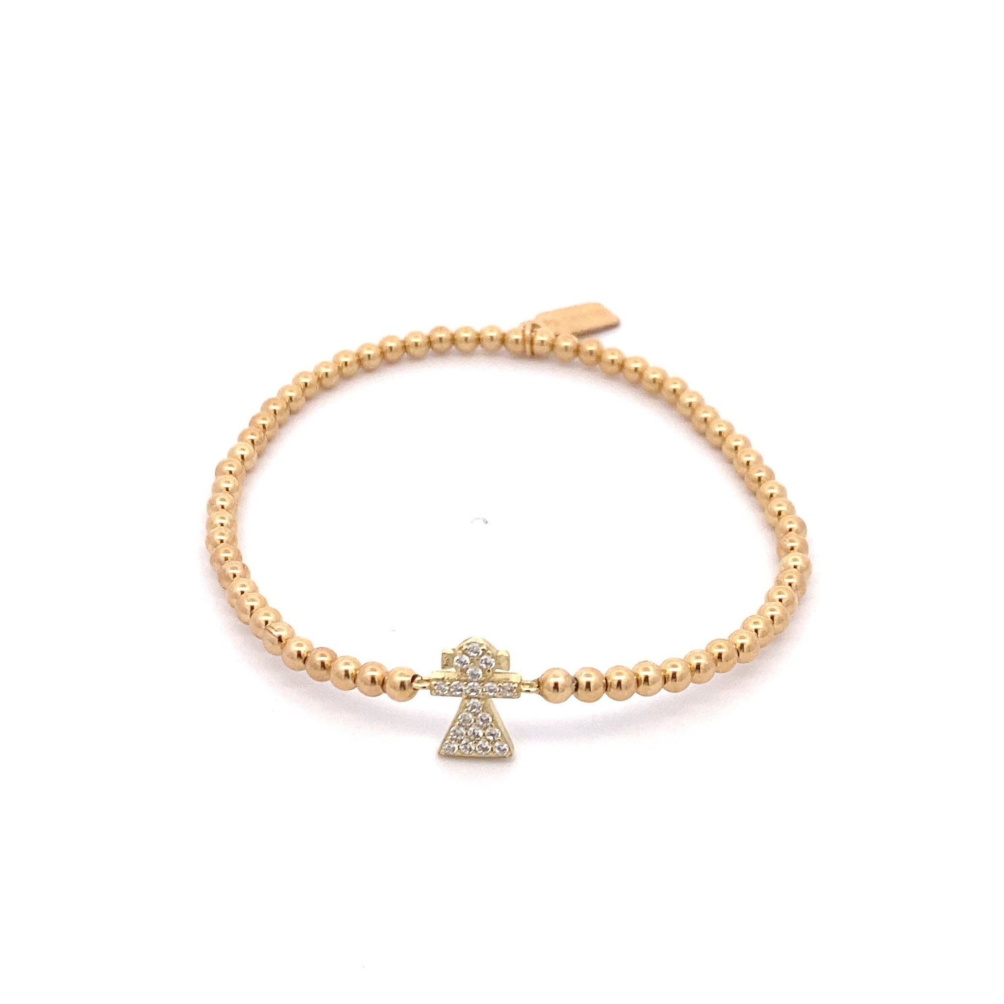 Elastic bracelet with gold-colored beads and a little girl charm.