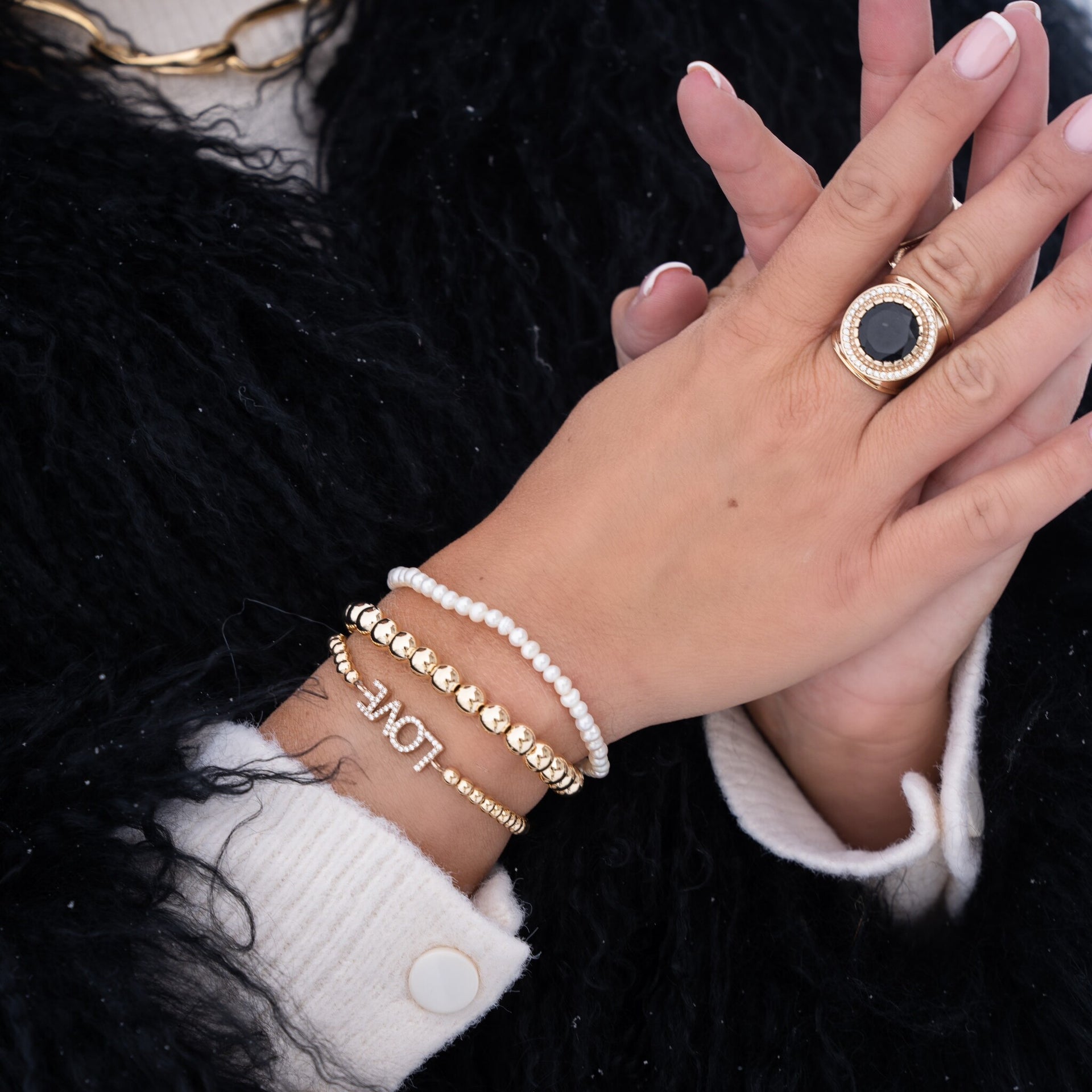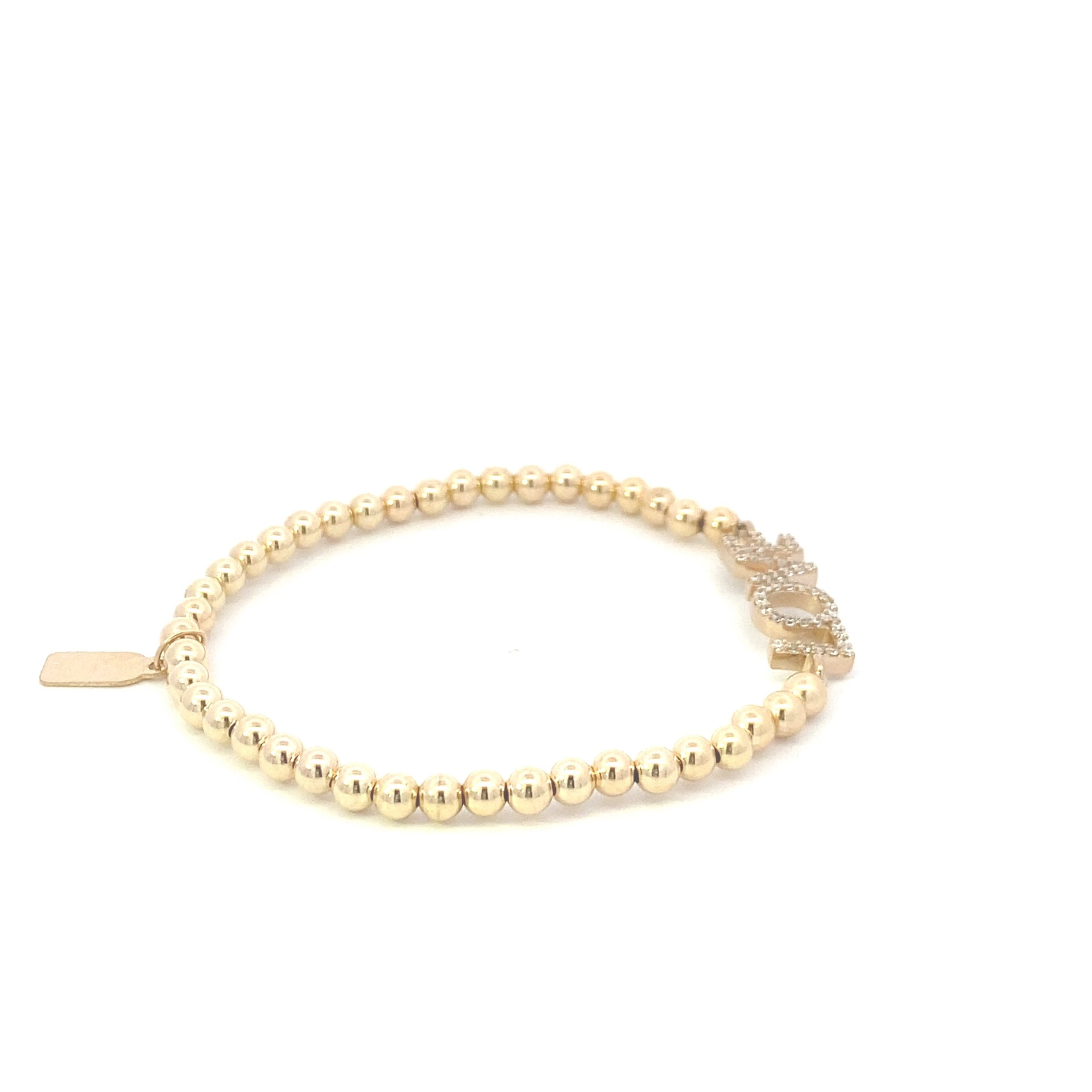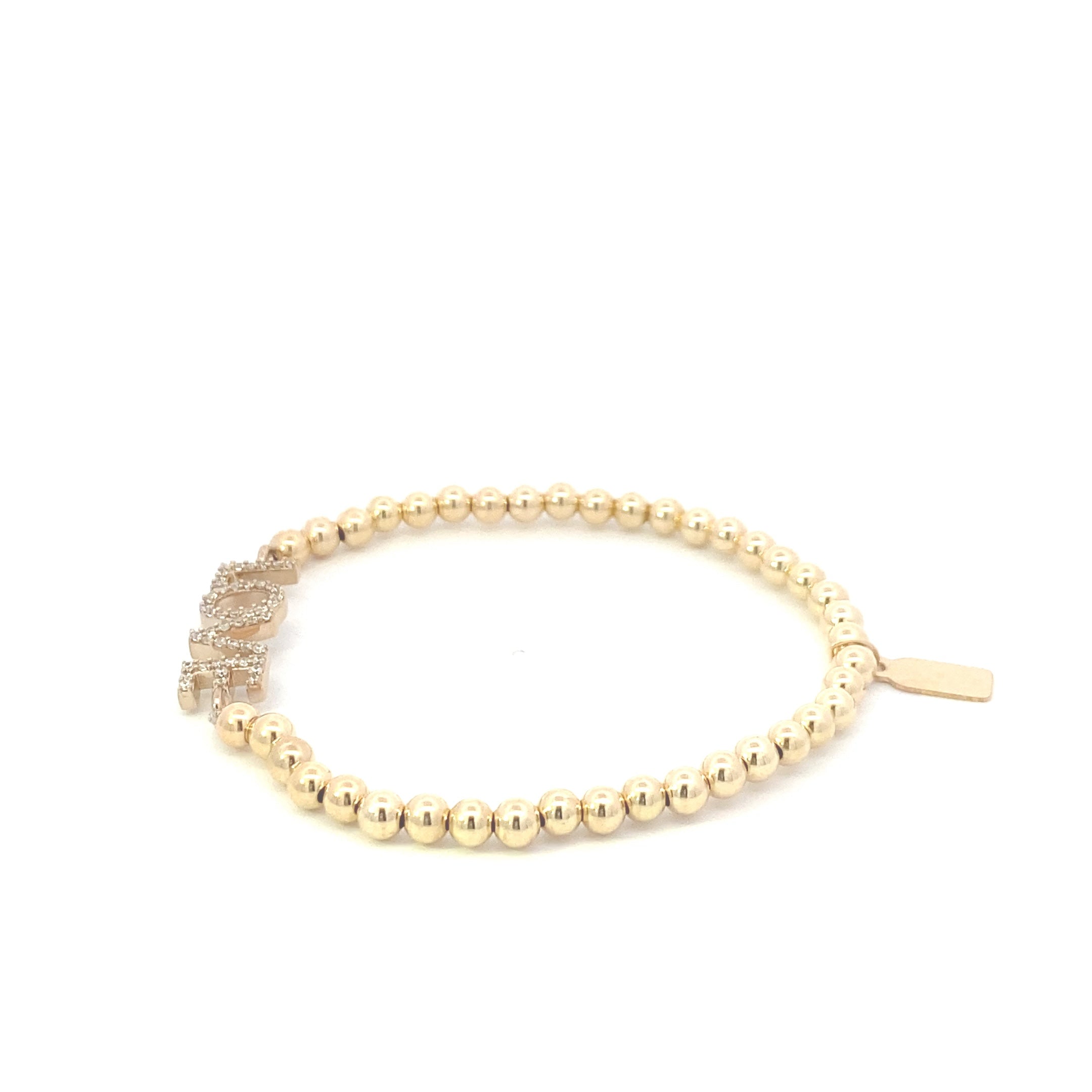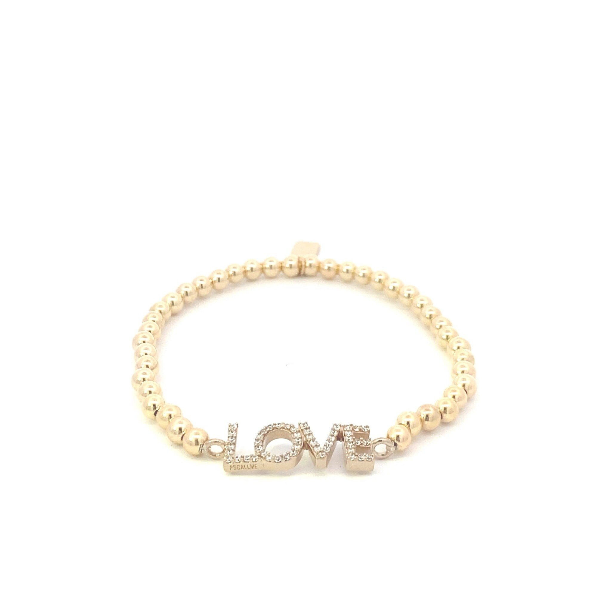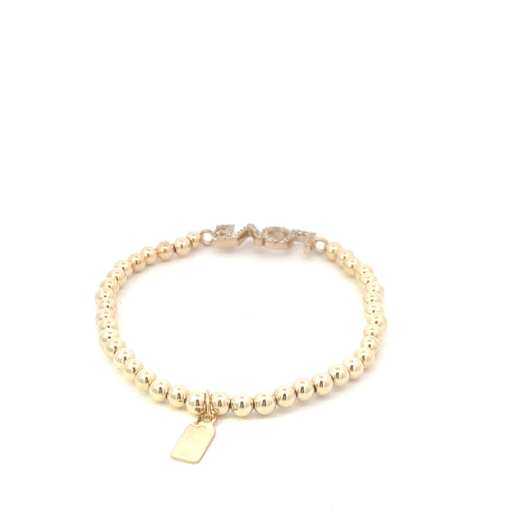 Elastic bracelet with gold-coloured beads and a charm featuring the word love with zirconia stones