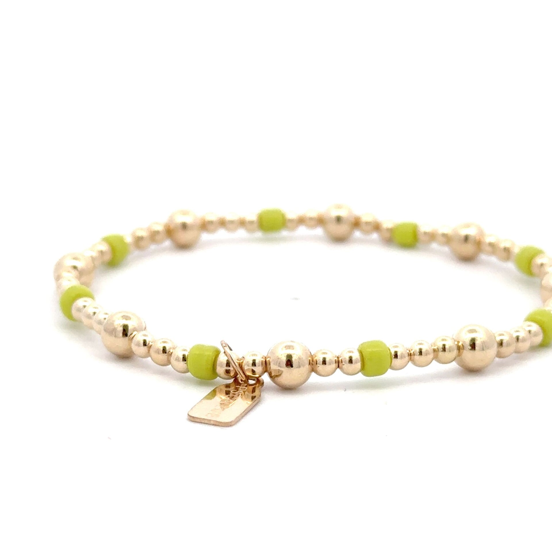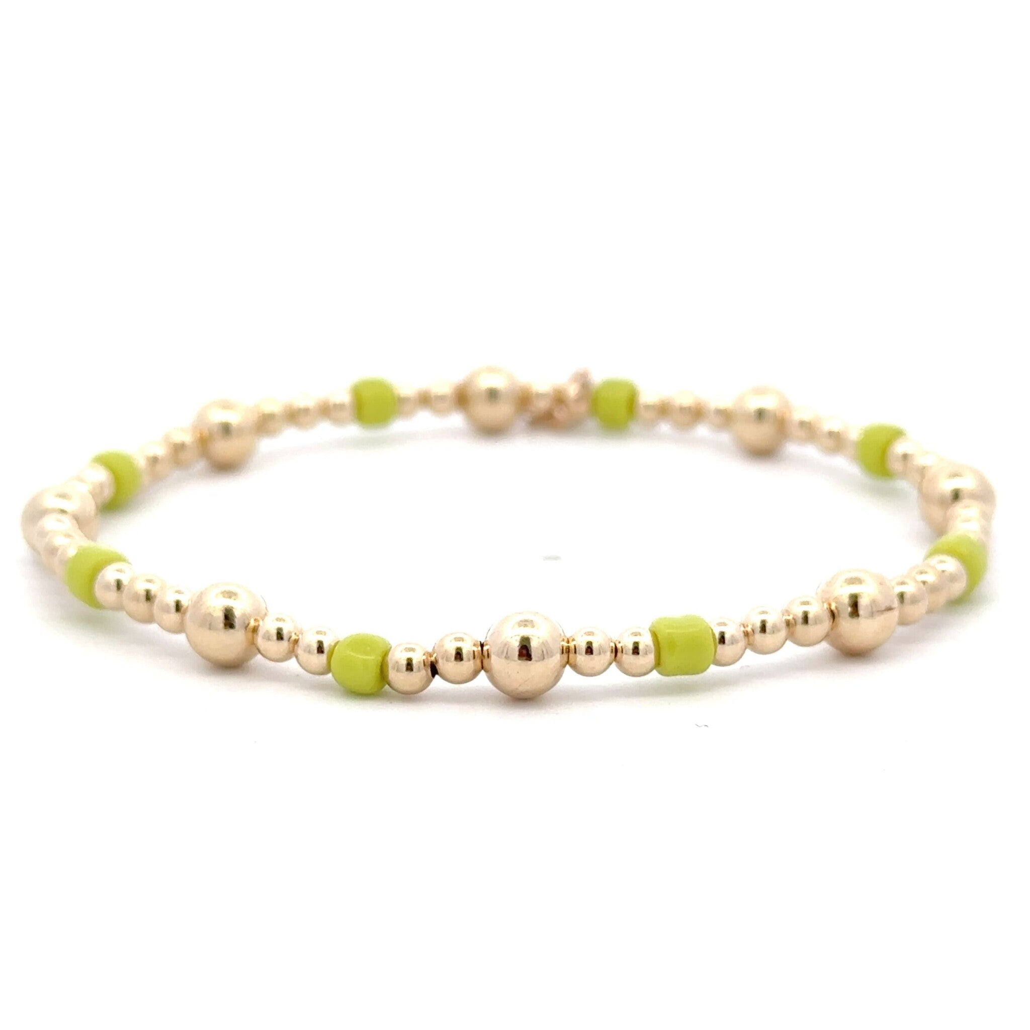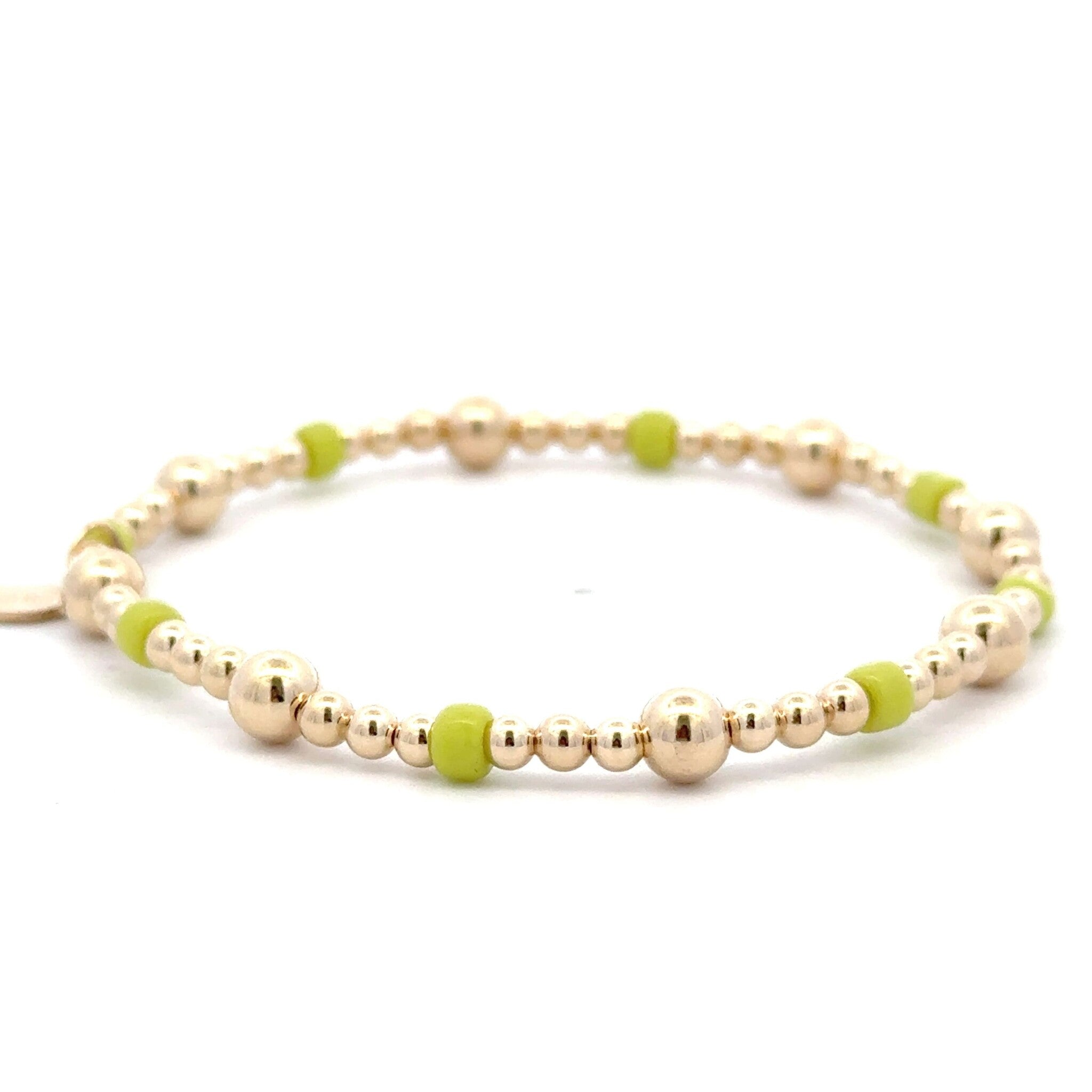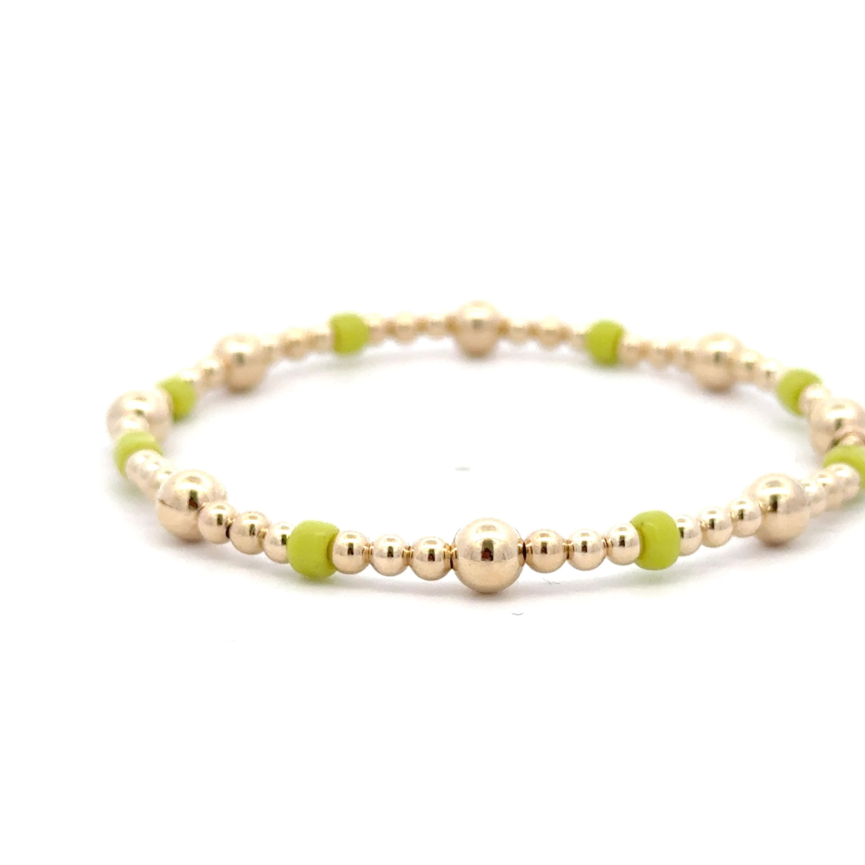 Elastic bracelet with gold colored balls with light green stones.