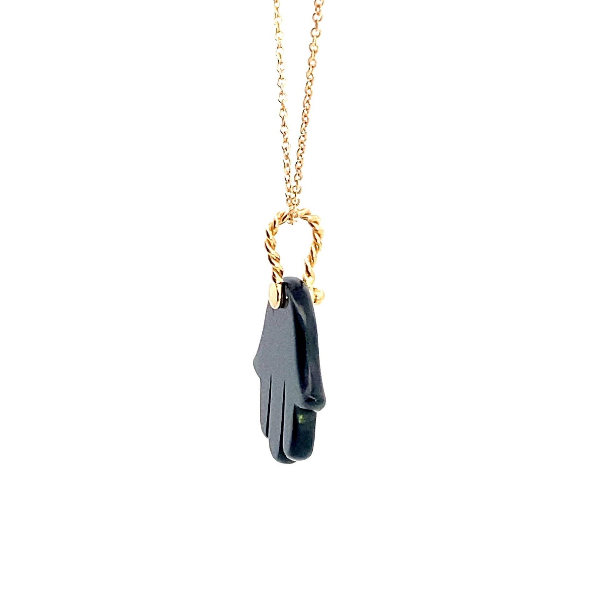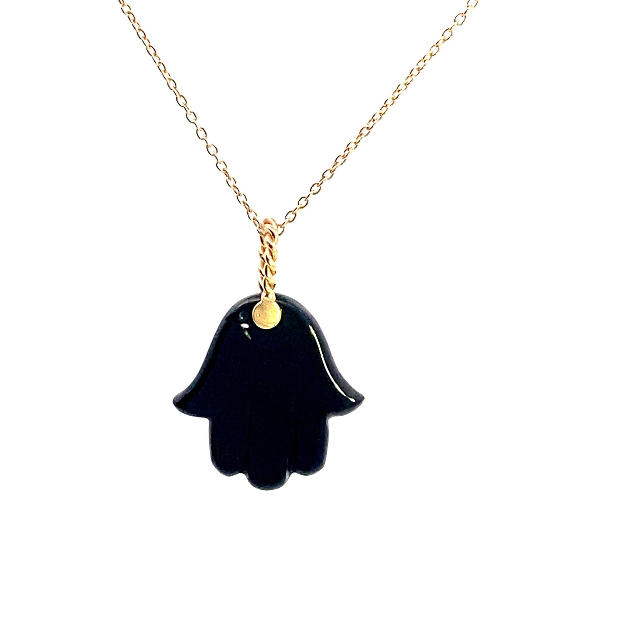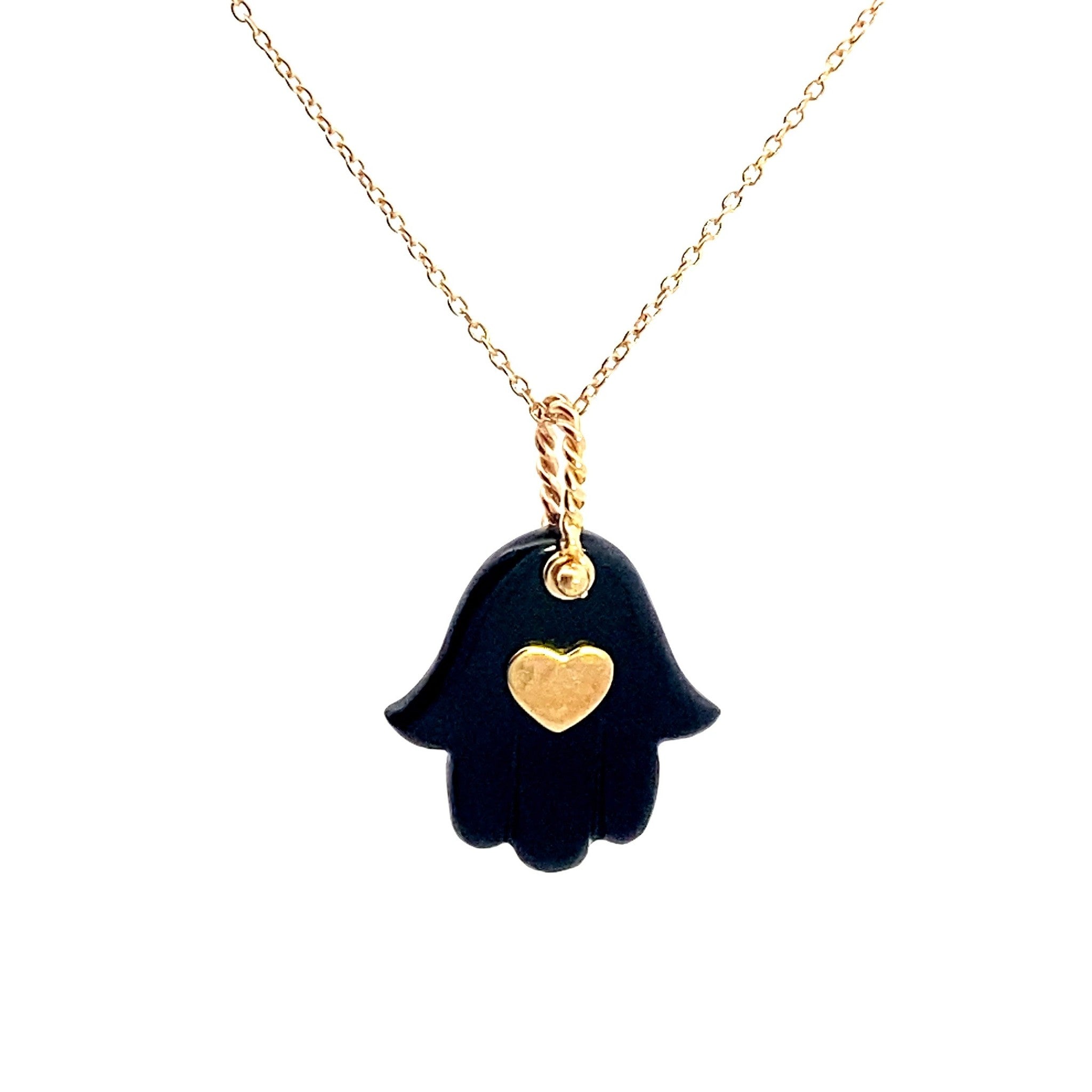 Gold-tone necklace with a colored charm in the shape of a hamsa hand with a gold-tone heart on top.