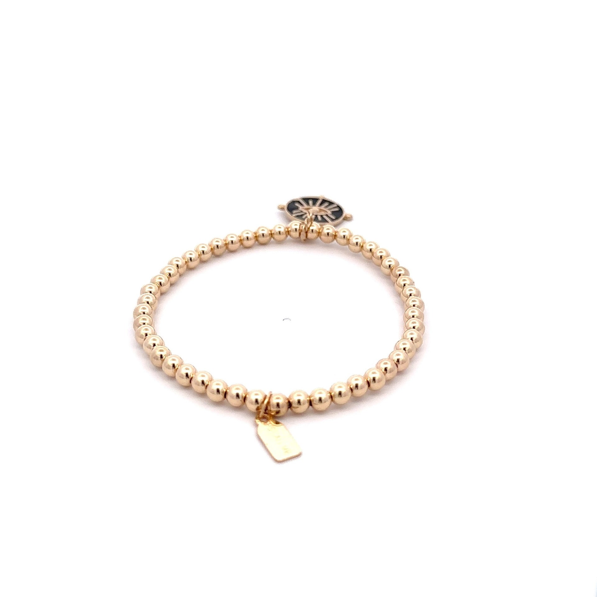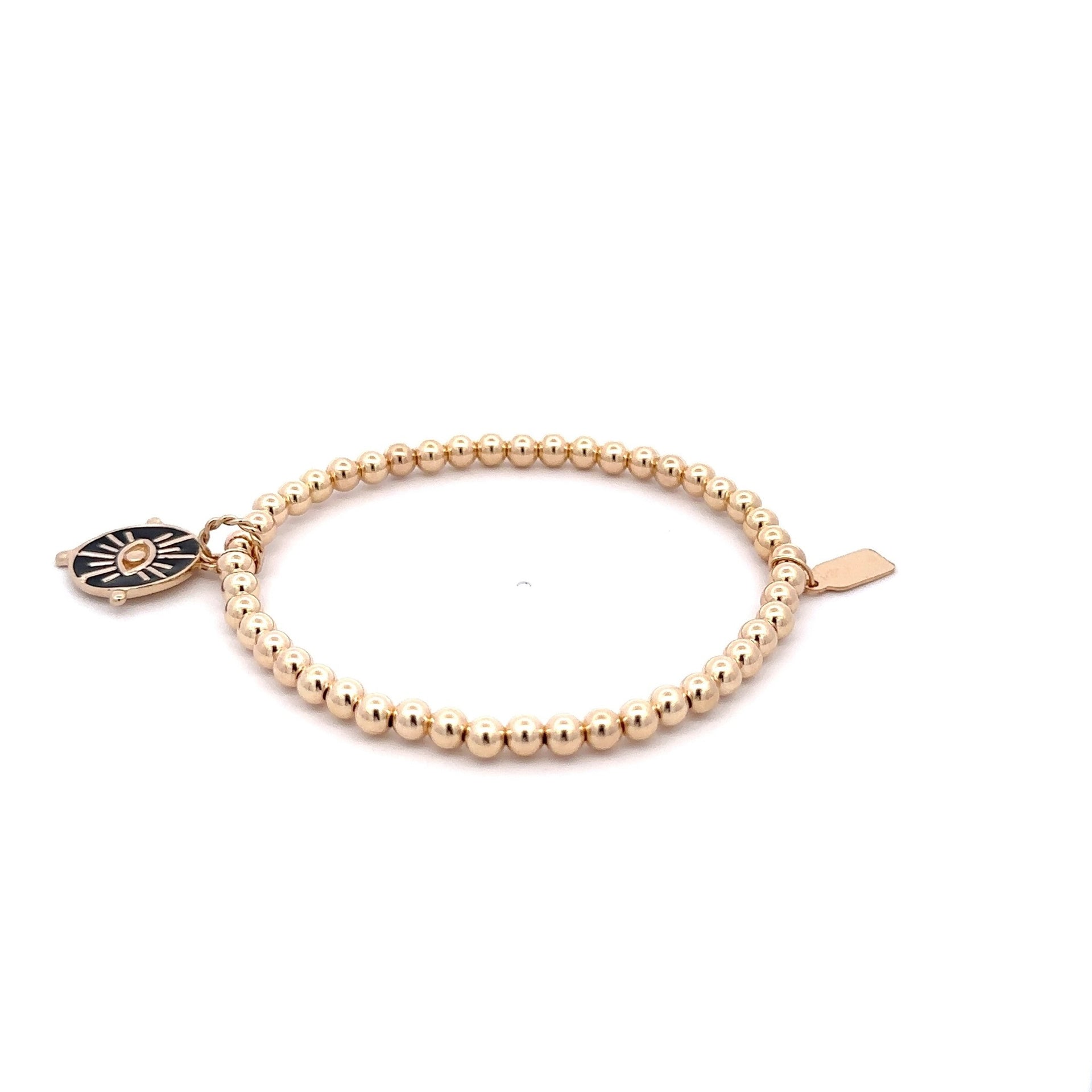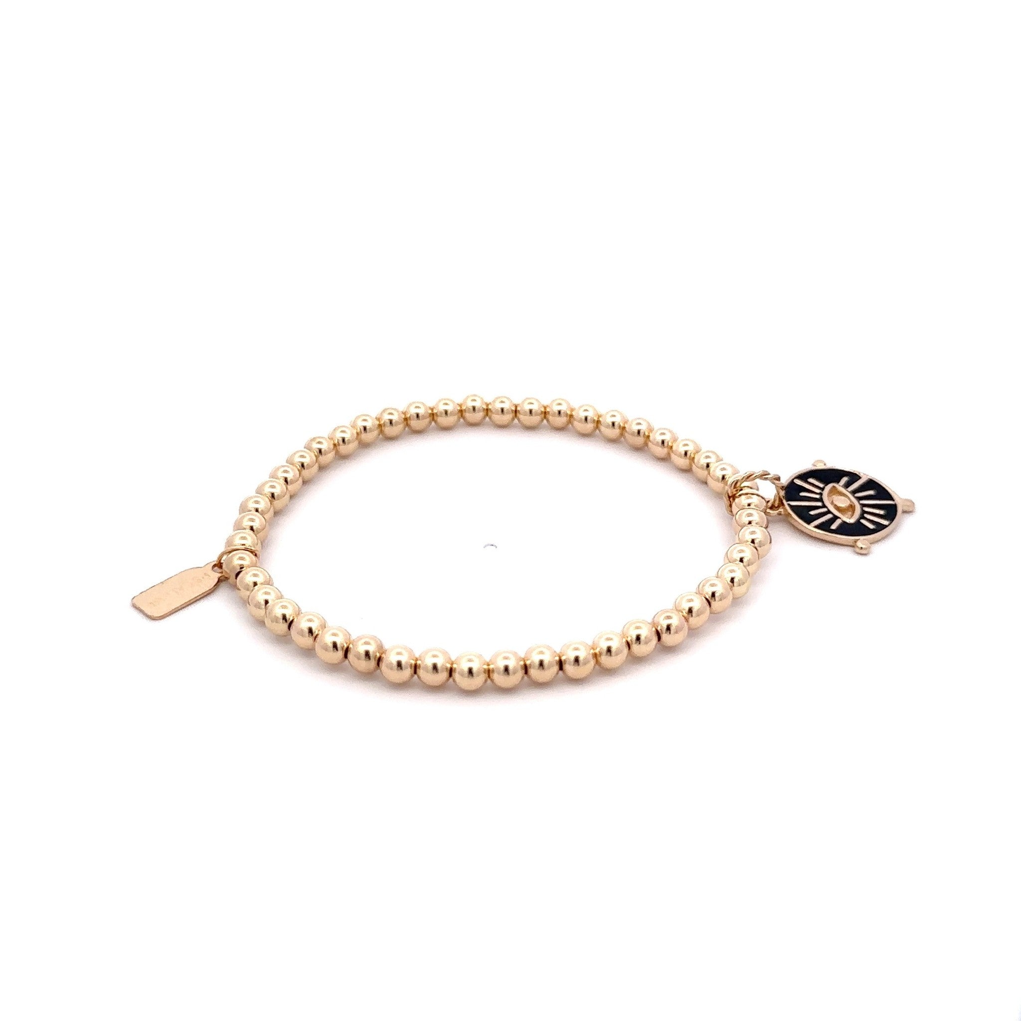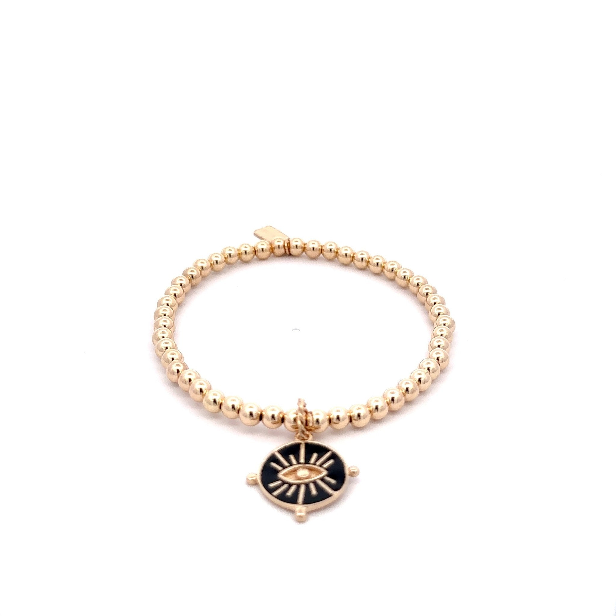Elastic bracelet with gold colored balls and a round colored pendant with an eye.