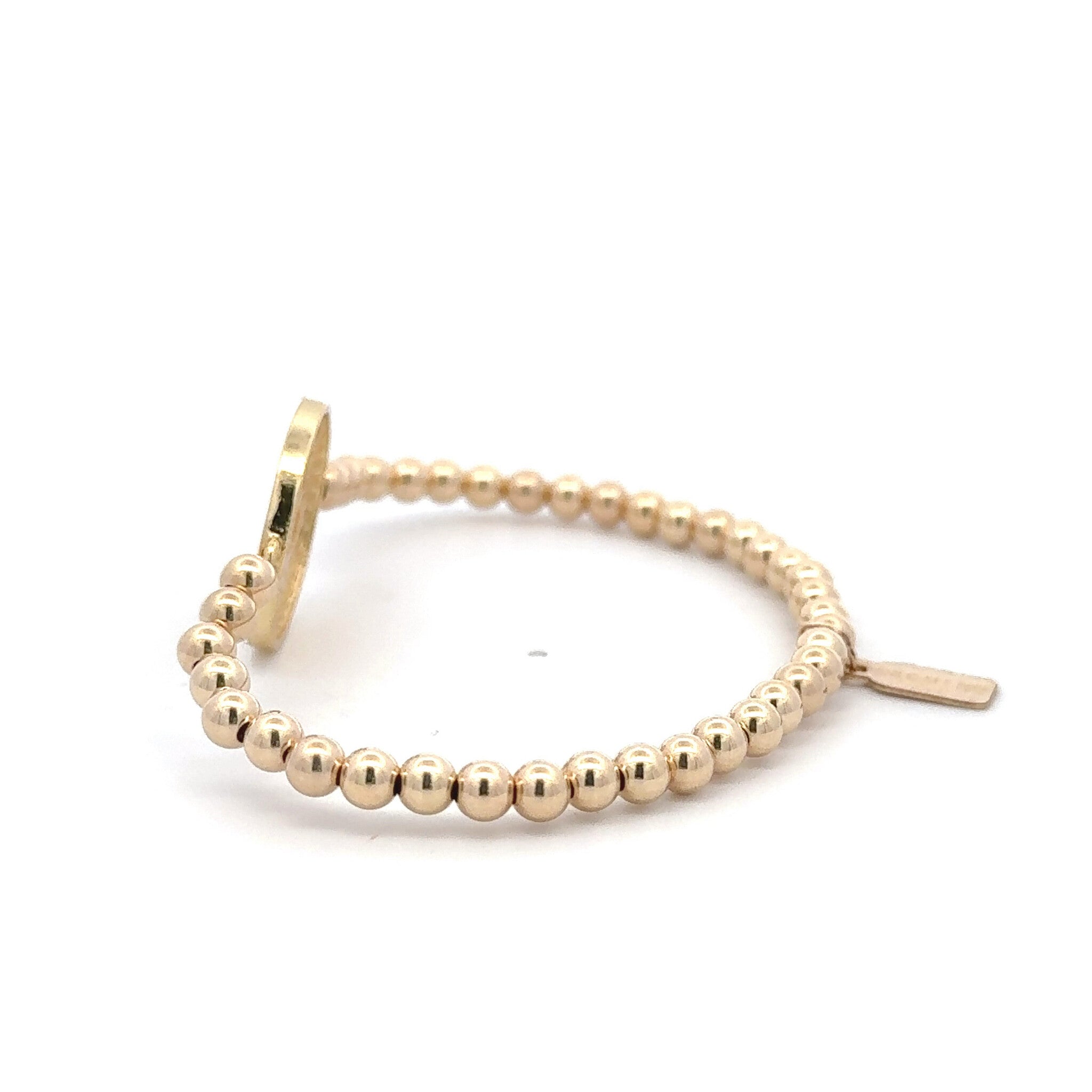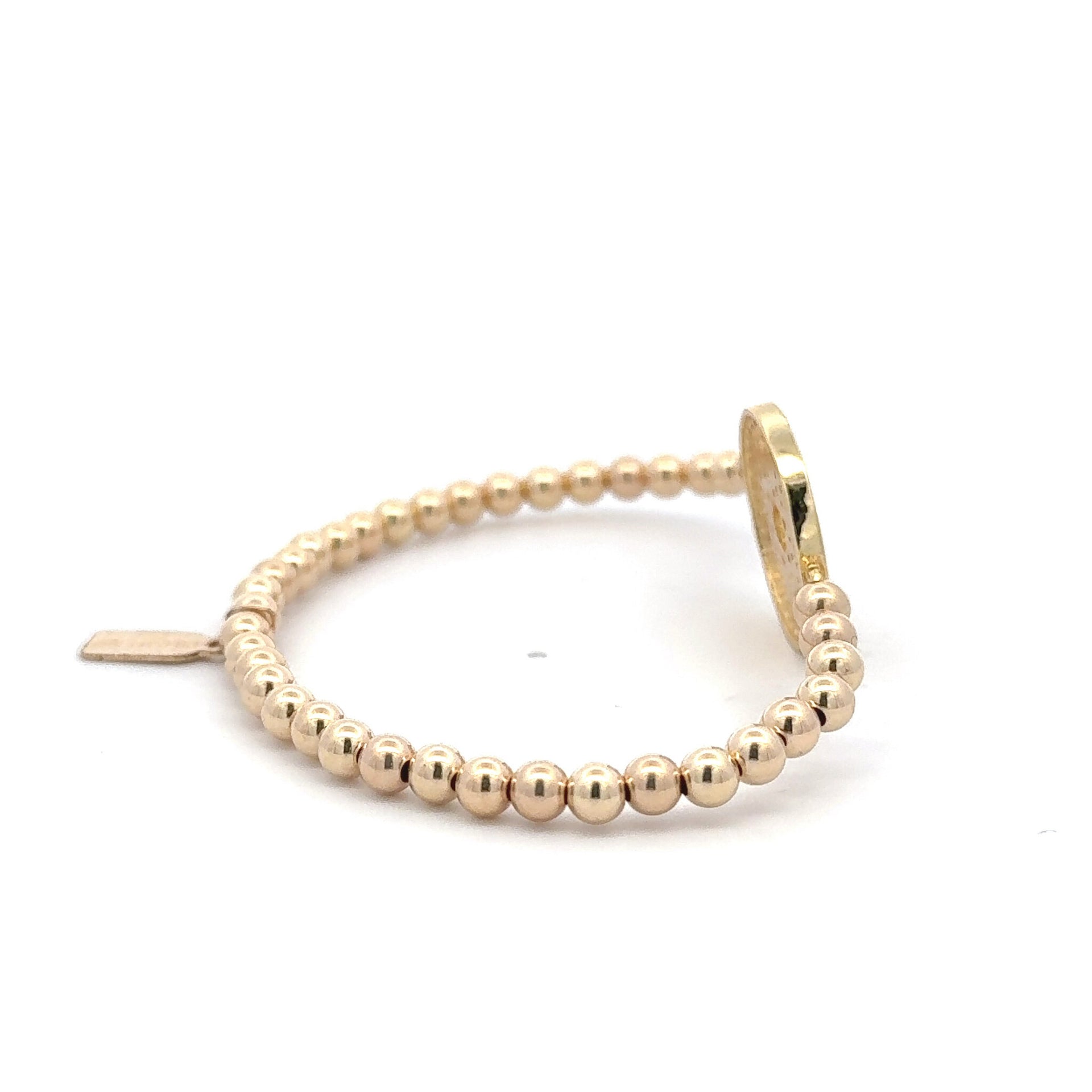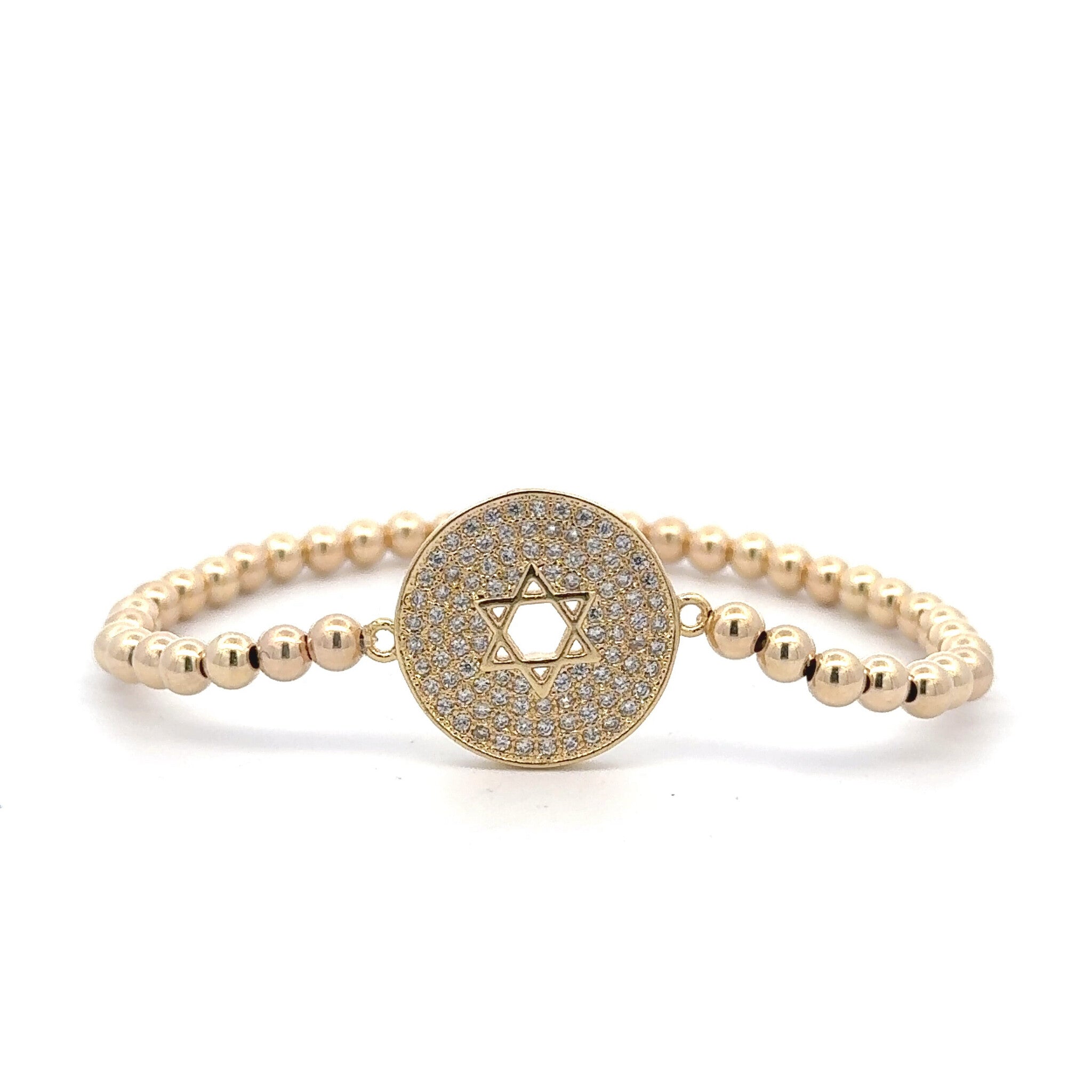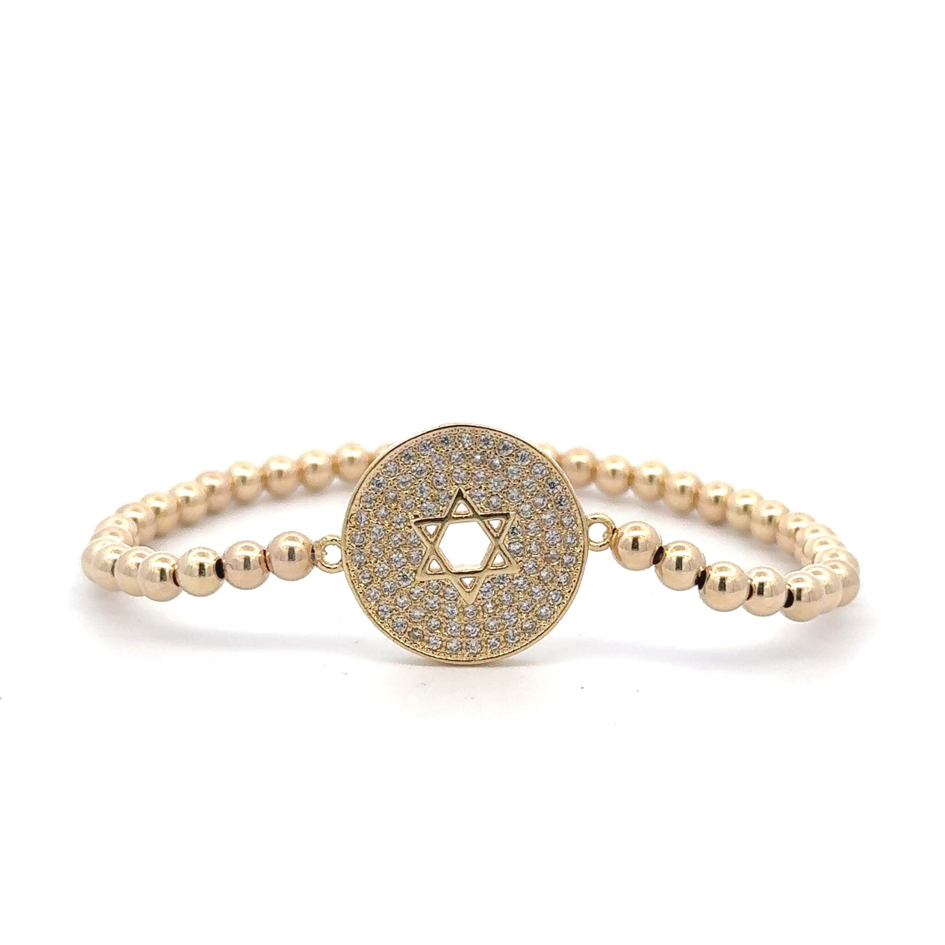 Elastic bracelet with gold-colored beads and a round charm featuring rhinestones and a star